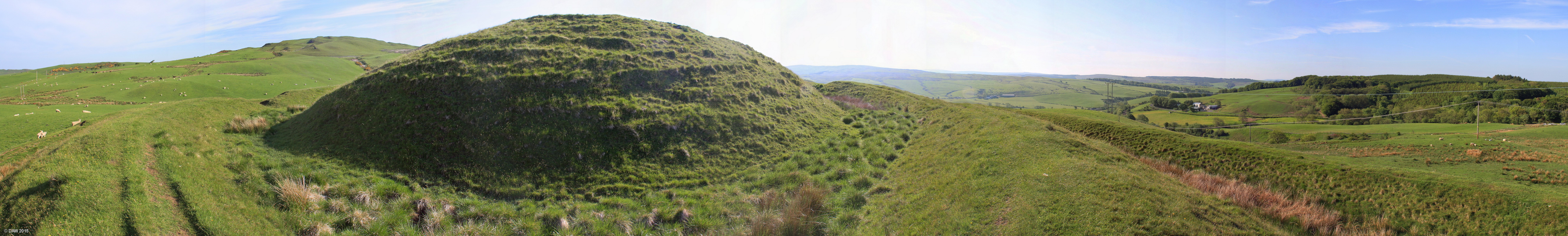 Dinvin is an impressive earth structure dating from some 2,500 years ago. The central mound is the Motte which is surrounded by two ring ditches best seen on the right hand side. This photo is several joined together which has distorted the circular nature of the rings. Map location.
