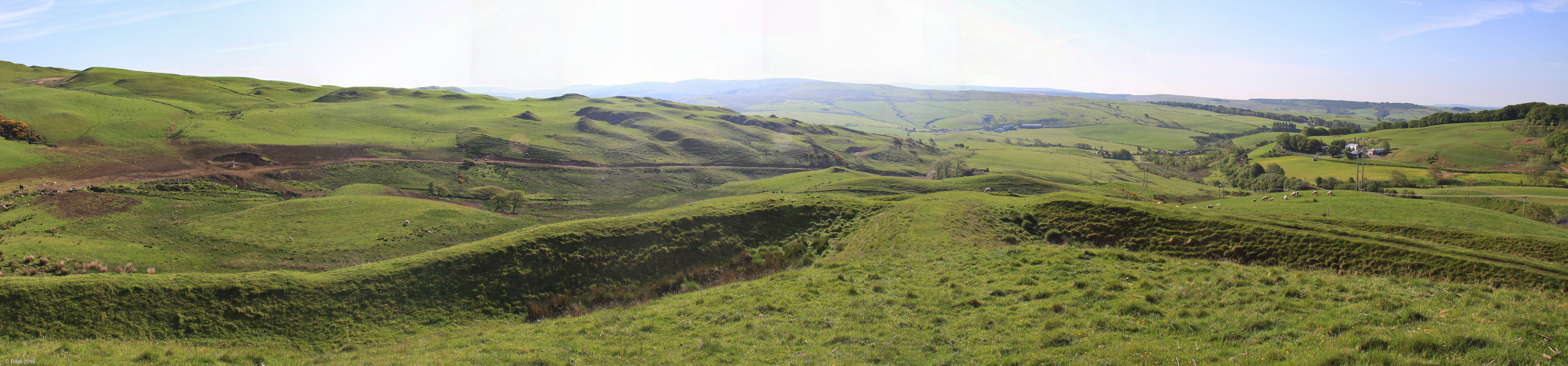 A view from the top of the Motte over the entrance ramp. The inner ring can be seen on either side and part of the lower ring is visible on the right. Its very difficult to convey the scale of these earthworks from photos other than from Aerial photos.