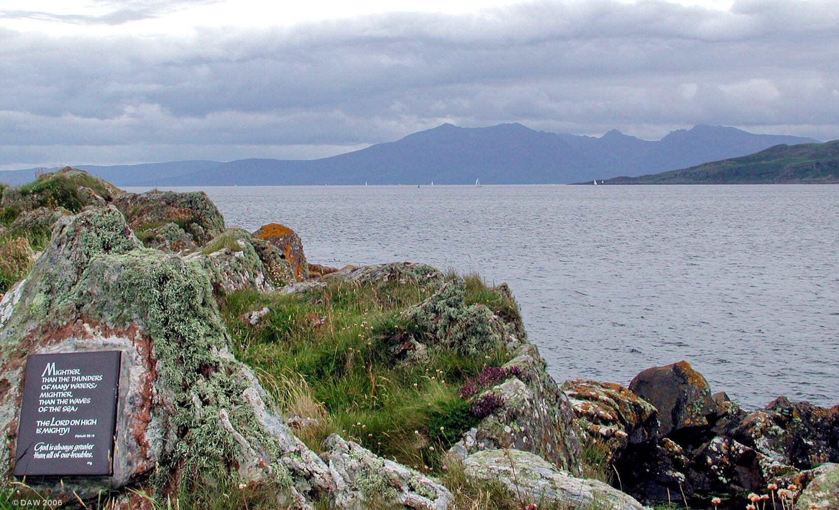 A quiet spot to contemplate the view over to Arran and the Psalm inscribed on the plaque on the left.