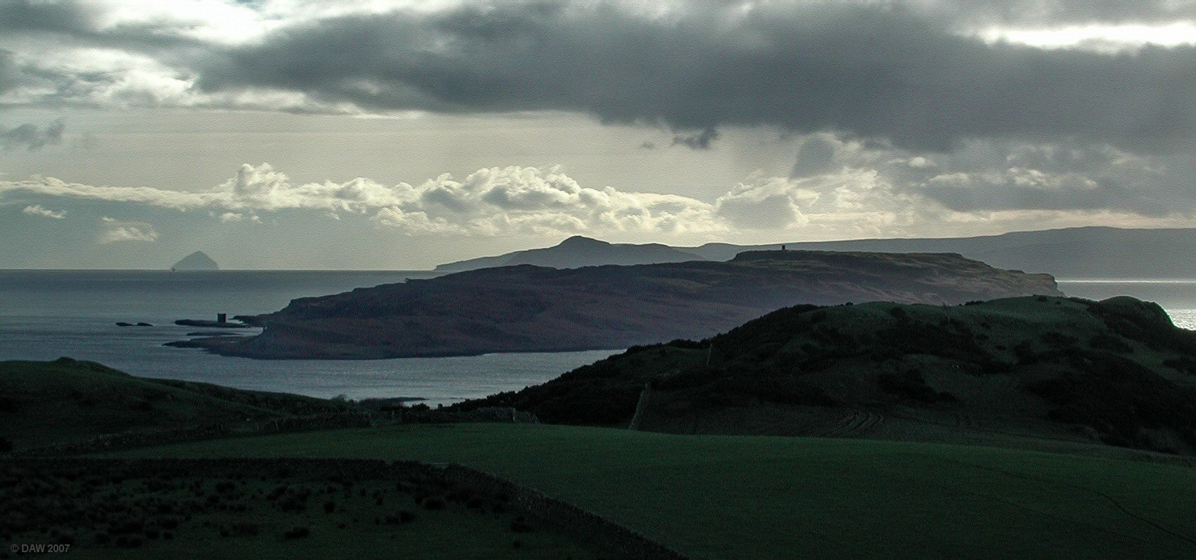 In this winter view you can see the Wee Cumbrae in the foreground, on the horizon in the distance is Ailsa Craig, on the right hand side behind the Cumbrae is Arran, you can also just make out the seperate Holy Isle who's highest point is centred behind the Wee Cumbrae. Map location