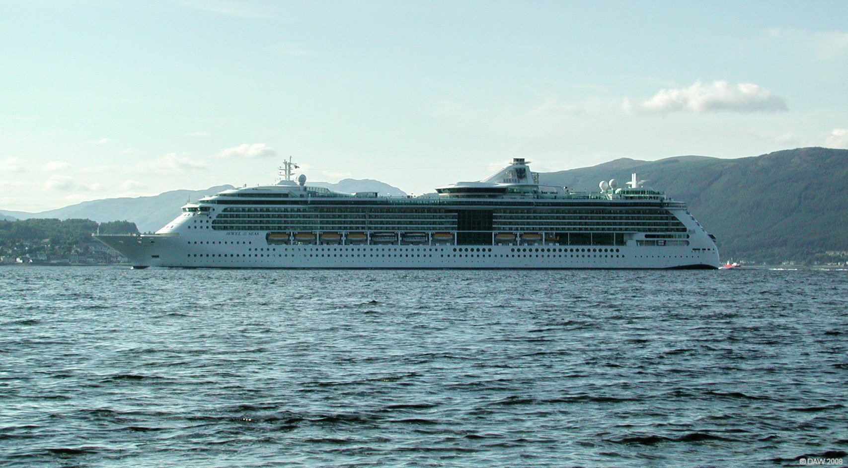 Completed in 2004 at the German Meyer Werft ship yard, she displaces some 90,000 tons and can carry 2,500 passengers at up to 25 knots. Large cruise ships are now a relatively common site at the Greenock Ocean Terminal since its only an hours coach trip from there to either Edinburgh or up the west coast to Loch Lomond or further.