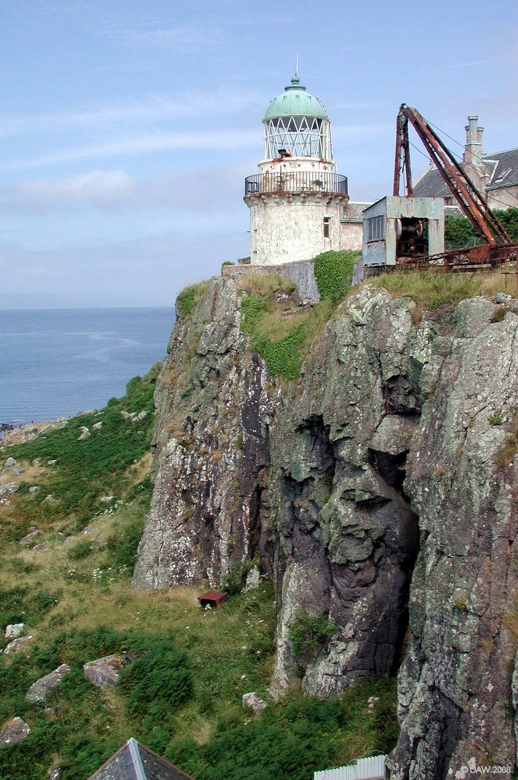 The now disused lighthouse on the western side of the Wee Cumbrae, the rusting crane would have been used to hoist supplies up the cliff face from the the small jetti below.