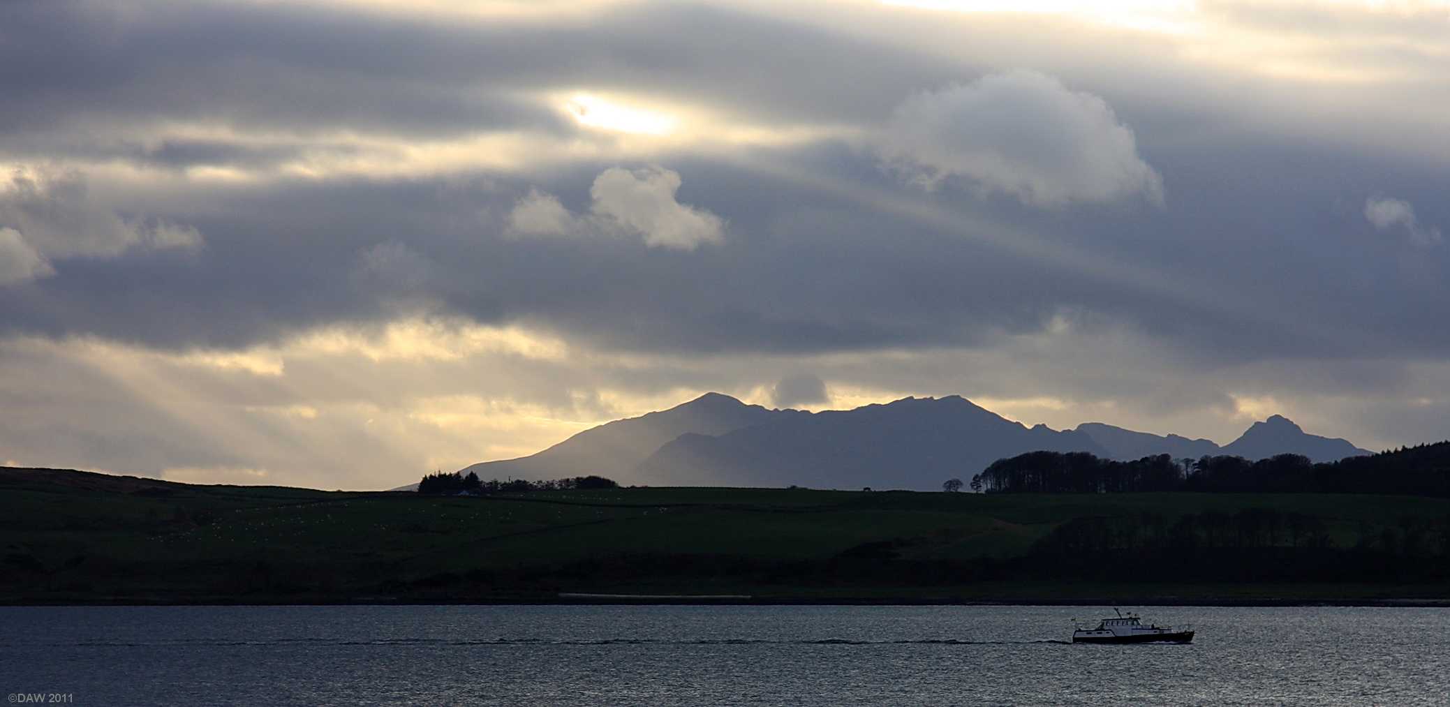 The winter sun sending shafts of light over Arran as seen from Largs.