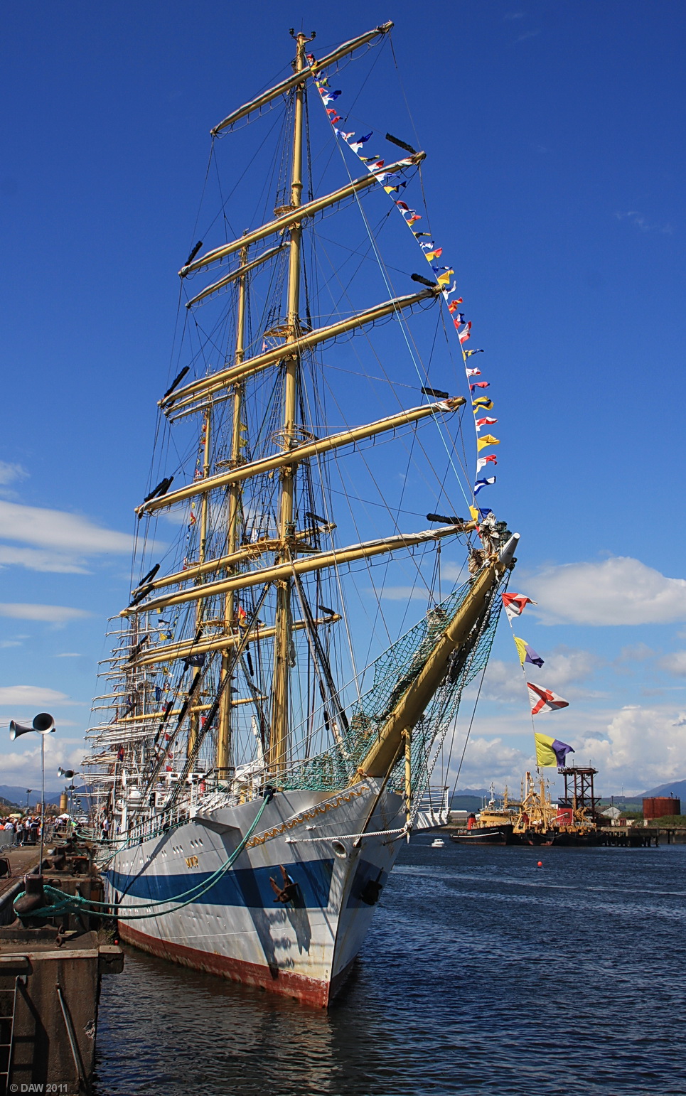 The Mir, meaning World or Peace, was built at Gdansk in Poland in 1987. She is one of the fastest saling ships in the world displacing some 2400 tons. She can carry a crew of up to 199 and is seen here in July 2011 during a stop over at Greenock in the Tall Ships race of that year.