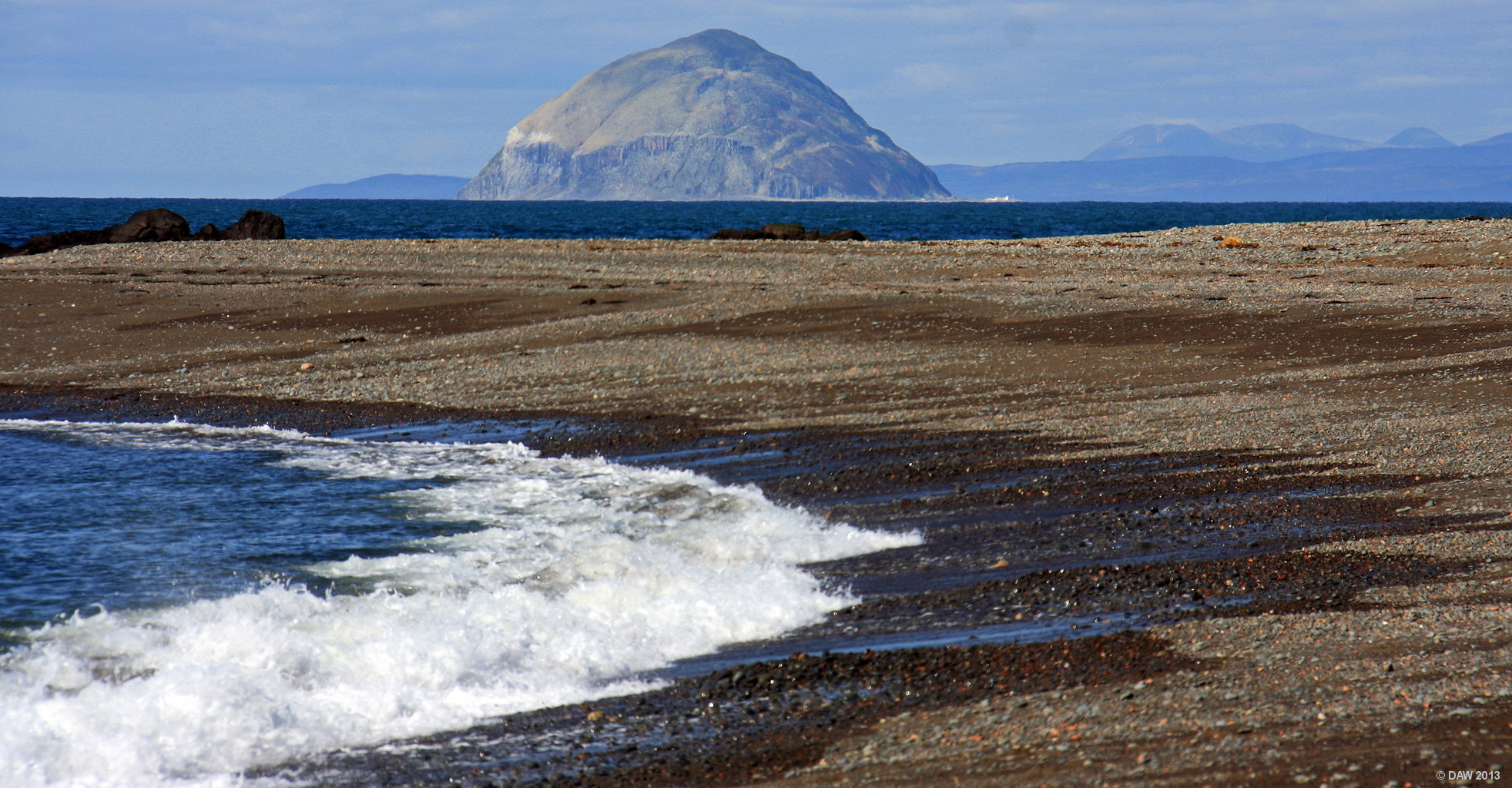 Looking out towards the island of Ailsa Craig from the beach at Ballantrae. The distant hills on the right are possibly on Mull, or maybe even the Paps of Jura.