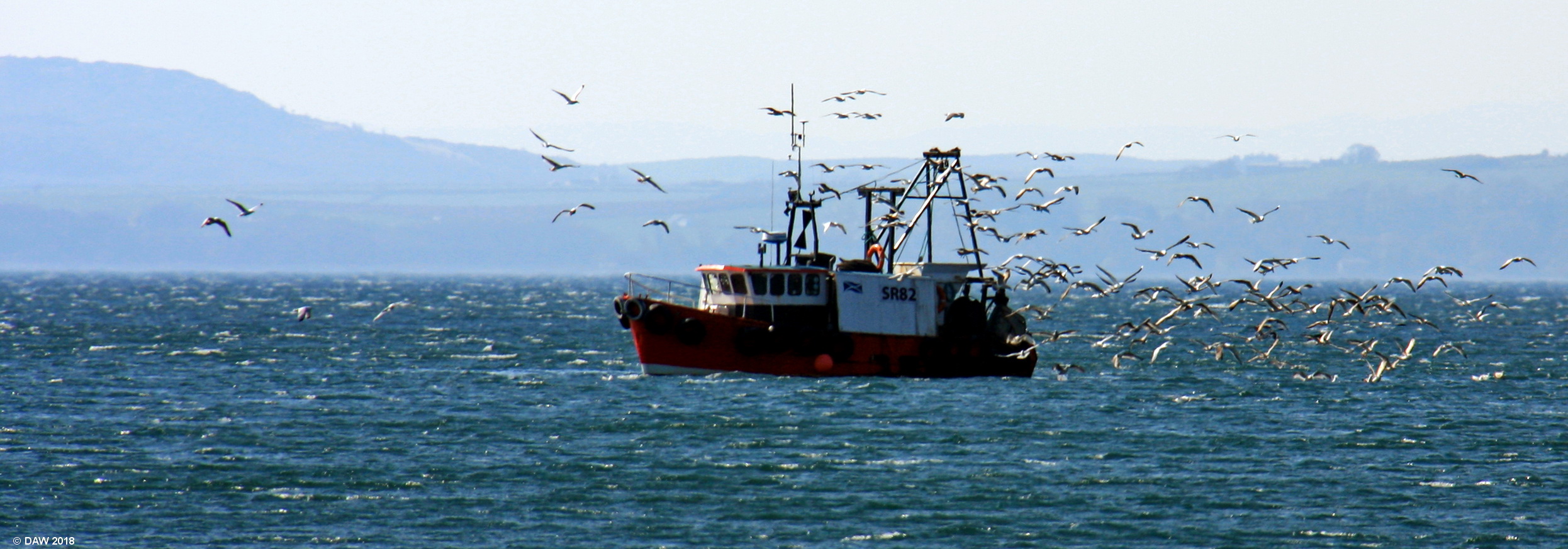 The Stranraer registered fishing boat Ranger heads down the Clyde pursued by a flock of gulls.