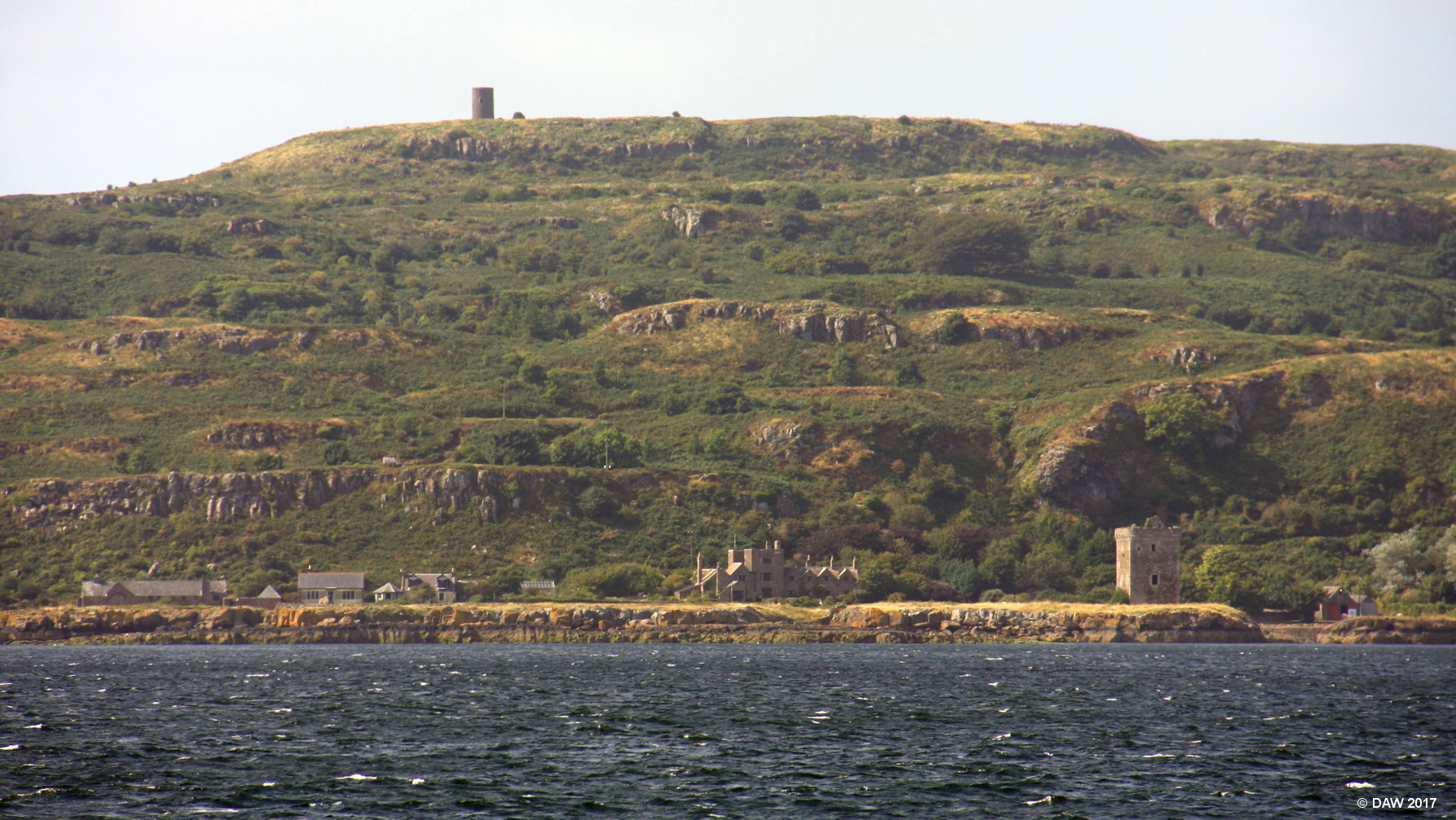 A distant view of the Wee Cumbrae from Hunterston. On the shore you can see Cumbrae House and on the right Cumbrae Castle. The tower on the top was the original Lighthouse.