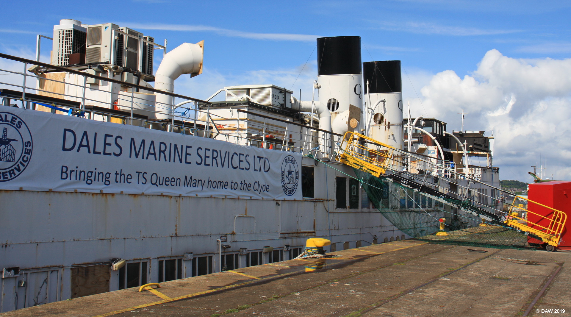 [url=https://tsqueenmary.org.uk/]The Queen Mary [/url] at Garvel docks in 2016.  Since this photo was taken much work has been done to the vessel and she is now berthed at the Science Centre in Glasgow but not yet open to the public.  The Queen Mary I remember in the 1970's had just one large yellow funnel in the centre so was easily distinguished from the other two large Clyde steamers with 2 funnels, The Dutchess of Hamilton and PS Waverly,