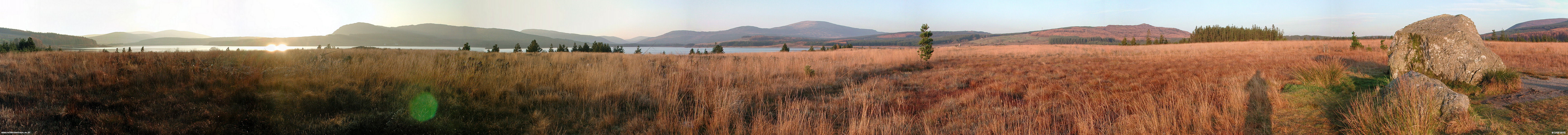 Panoramic view from Bruce's stone on Moss Raploch next to Clatteringshaws Loch. Robert the Bruce is said to have rested here after defeating the English in 1307. The battlefield site is now submerged by the Loch which was created in the 1930's as part of the Galloway Hydro Electric scheme. Map location.