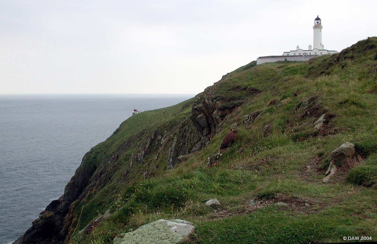 If you keep driving down the Rhins of Galloway you eventually run out of road. At that point you can't go any further south in Scotland, you are at the same latitude as Durham in Northern England. The lighthouse was built in 1828 and stands on cliffs some 260ft high, the foghorn can be seen lower down. In 1988 the lighthouse was automated and the outbuildings are now privately owned.