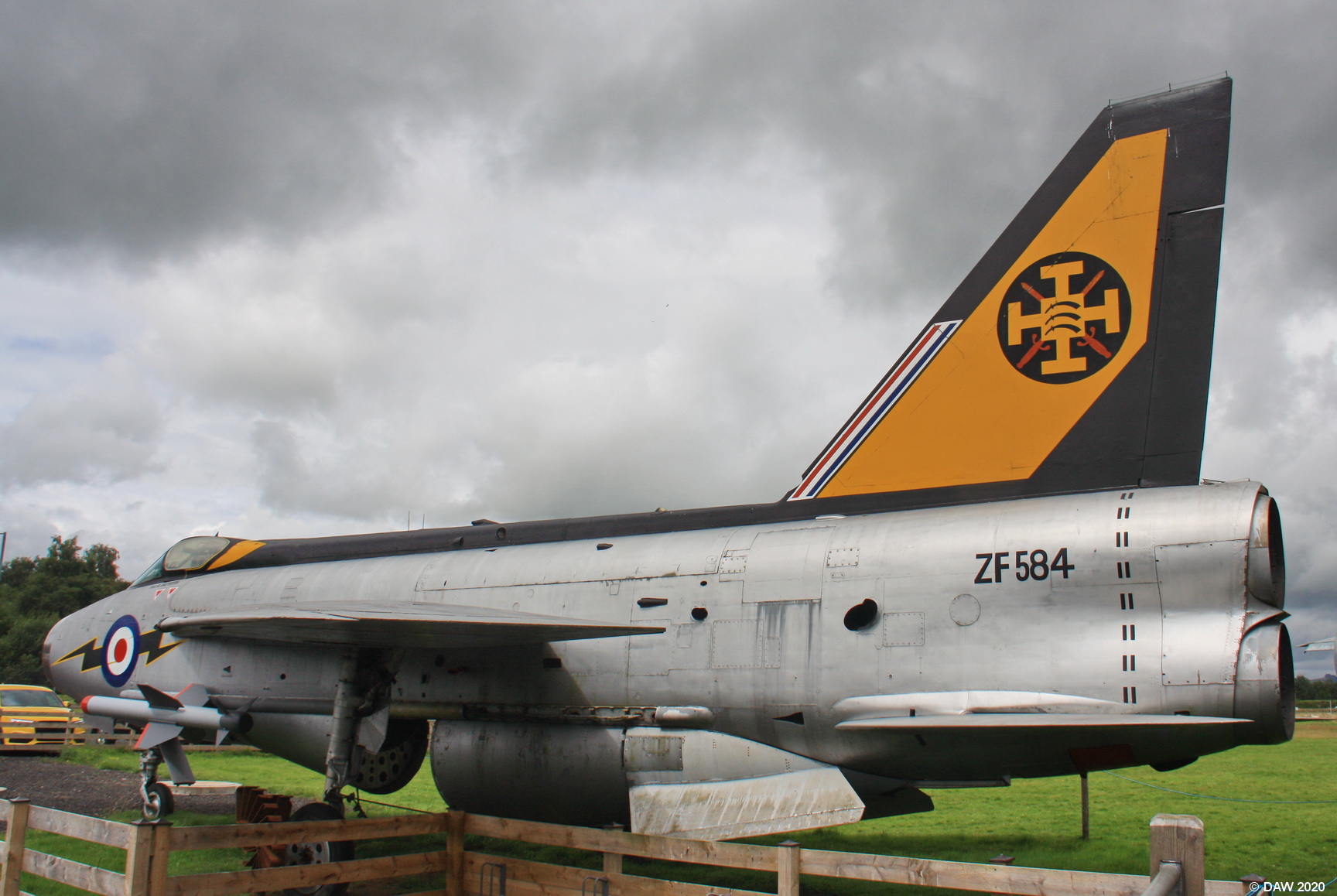A view of the F53 Lightening at Dumfries & Galloway Aviation museum. This view shows the unusual arrangement of its twin engines, one on top of the other. The lightening's primary roles was as an interceptor, it had an astonishing climb rate of 20,000ft per minute and was capable of level flight speed of Mach 2. It was the RAF's first supersonic fighter. It was designed to meet incoming Soviet bombers at altitudes of up to 60,000ft. It has been claimed by some pilots to have reached over 80,000ft.