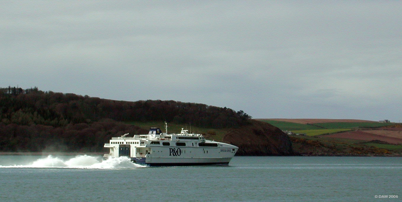 Stranraer has long been the port of departure for those wanting to visit Northern Ireland from Scotland.  Here, the twin hull Superstar Express can be seen picking up speed as she sails down Loch Ryan.  She is capable of a top speed of 41 knots and can cross the Irish Sea to Larne in 60 minutes [url=http://streetmap.co.uk/map.srf?X=206189&Y=569042&A=Y&Z=115/]Map location[/url]