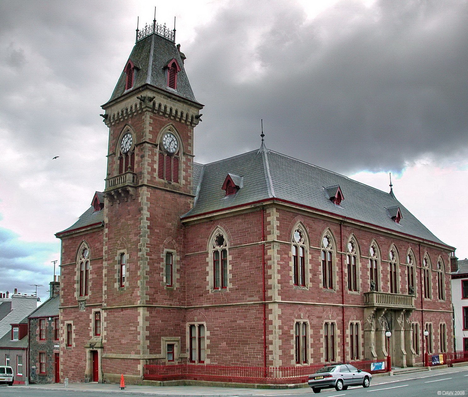 Even on an overcast day like this the former County buildings with its flamboyant French gothic style of architecture is an impressive sight in the town square at Wigtown.  Built in 1862 it was the county buildings until 1973 after which it was not well maintained.  In the last few years it has been fully restored to its former glory and now houses a library and local Museum. [url=http://www.streetmap.co.uk/streetmap.dll?G2M?X=243382&Y=555362&A=Y&Z=1/]Map location. [/url]
