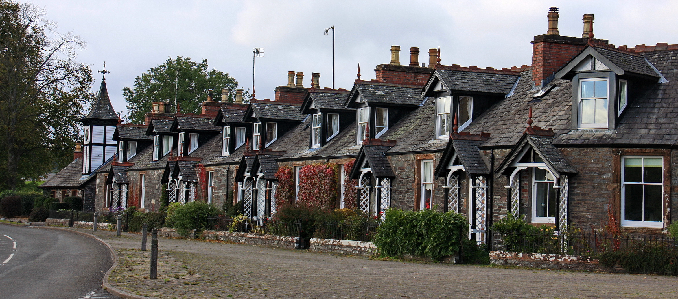 These category B listed buildings were built in 1901 as 9 dwellings but later converted to 6. To see the most unusual feature you have to round the back where there is an octagonal outside toilet block that served all the cottages.