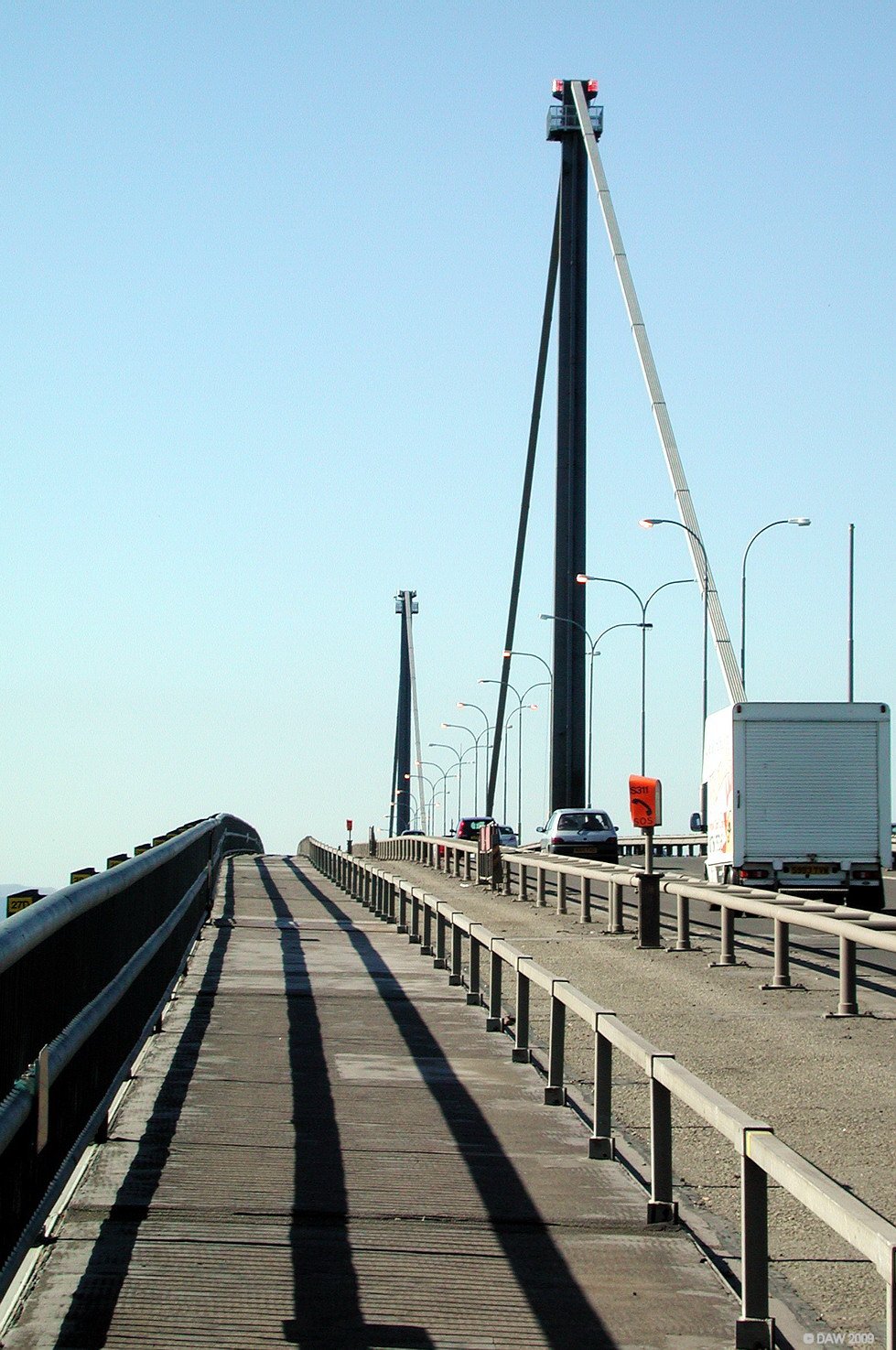 Looking up the walkway on the Erskine bridge from the North side. When the bridge was opened by Princess Anne in July 1971 its 1000ft span between the towers was the longest Cable stay box girder bridge in the world. It has long since been surpassed. Map location.