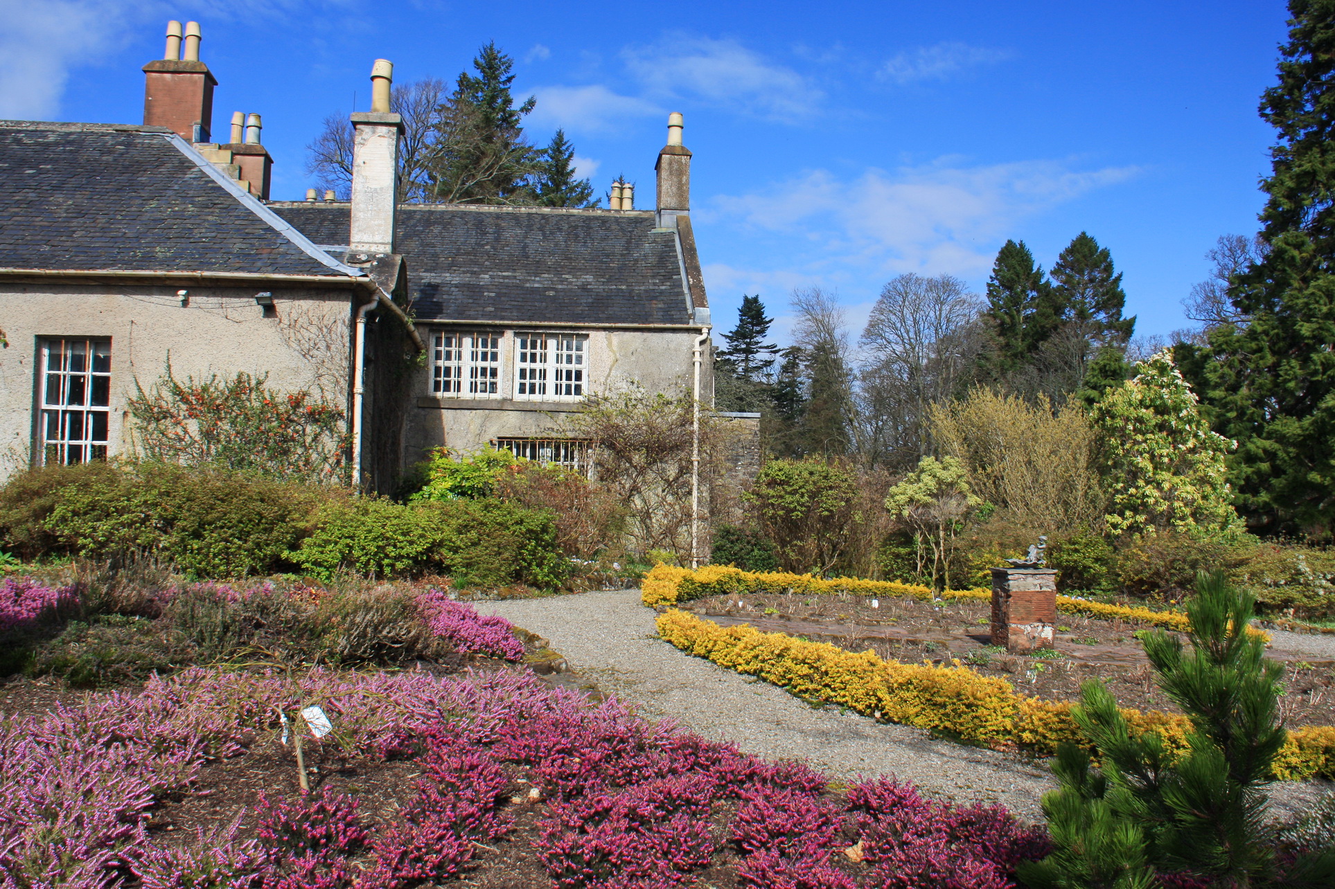 Most of the colour in the garden in this April photo is from varies Heathers. The gardens are owned by The National Trust for Scotland and are open from spring until Autumn.