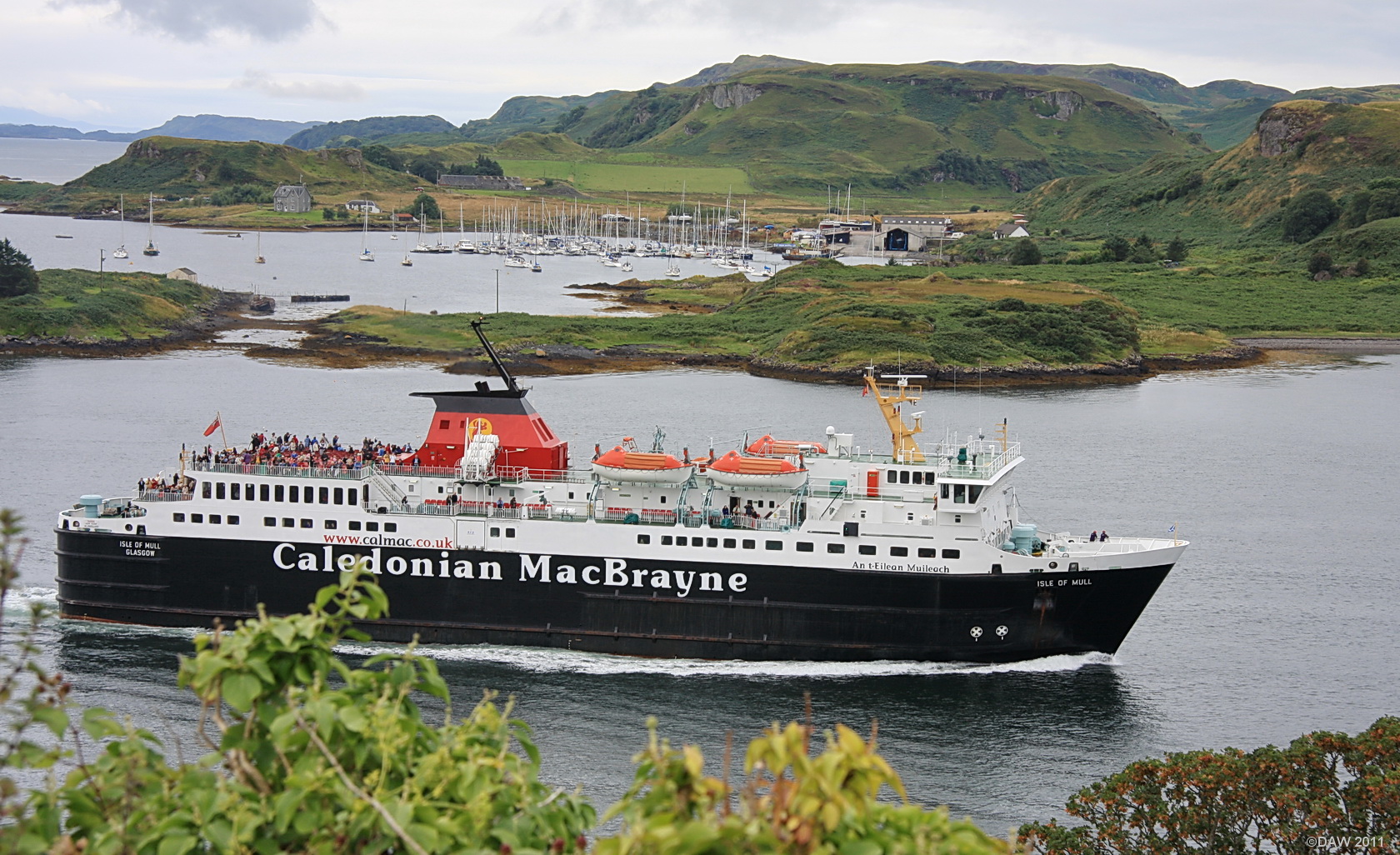 The Calmac car ferry Isle of Mull heads out of Oban harbour past the north end of Kerrera on its way to the Island of Mull.