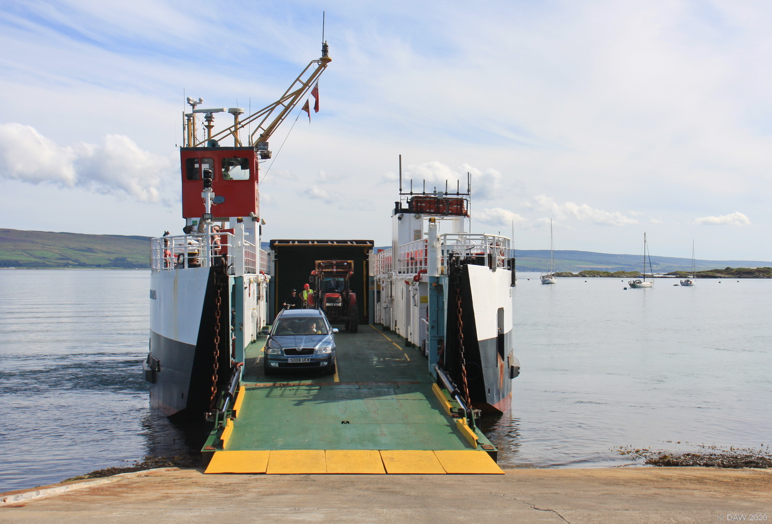 M.V. Loch Ranza unloading at Adminish on the Island of Gigha. Built in 1986 by R Dunston in Yorkshire she can carry 12 cars and 200 passengers with a crew of just 3.