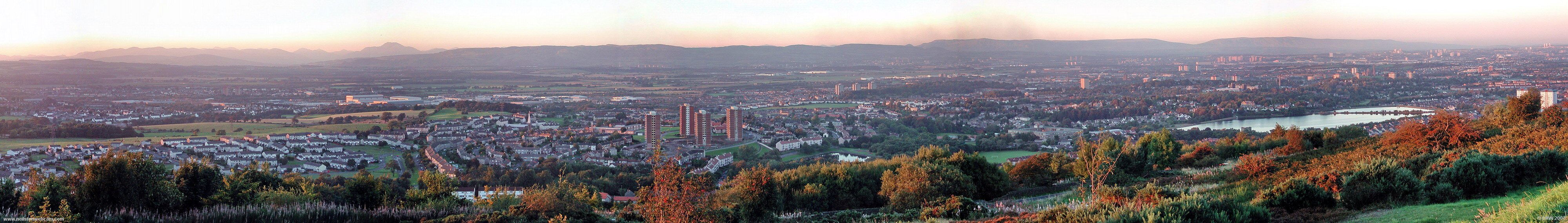 The tower blocks of the Glasgow in the distance on the right are illuminated by the setting sun. Taken in 2004 before the Foxbar flats were demolished. The Distinctive outline of Ben Lomond can be left of centre.