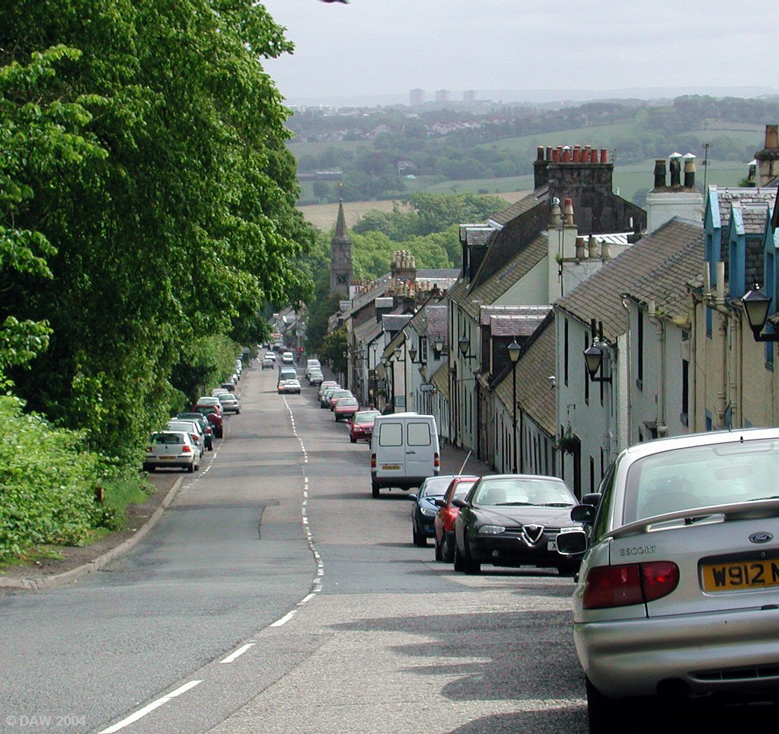 A planned village dating from 1796. It was built by the Earl of Eglinton for the workers of his cotton factory. The spire of the Church built in 1790 is visible down the hill, in the distance the tower blocks of the modern planned town of East Kilbride can be seen.