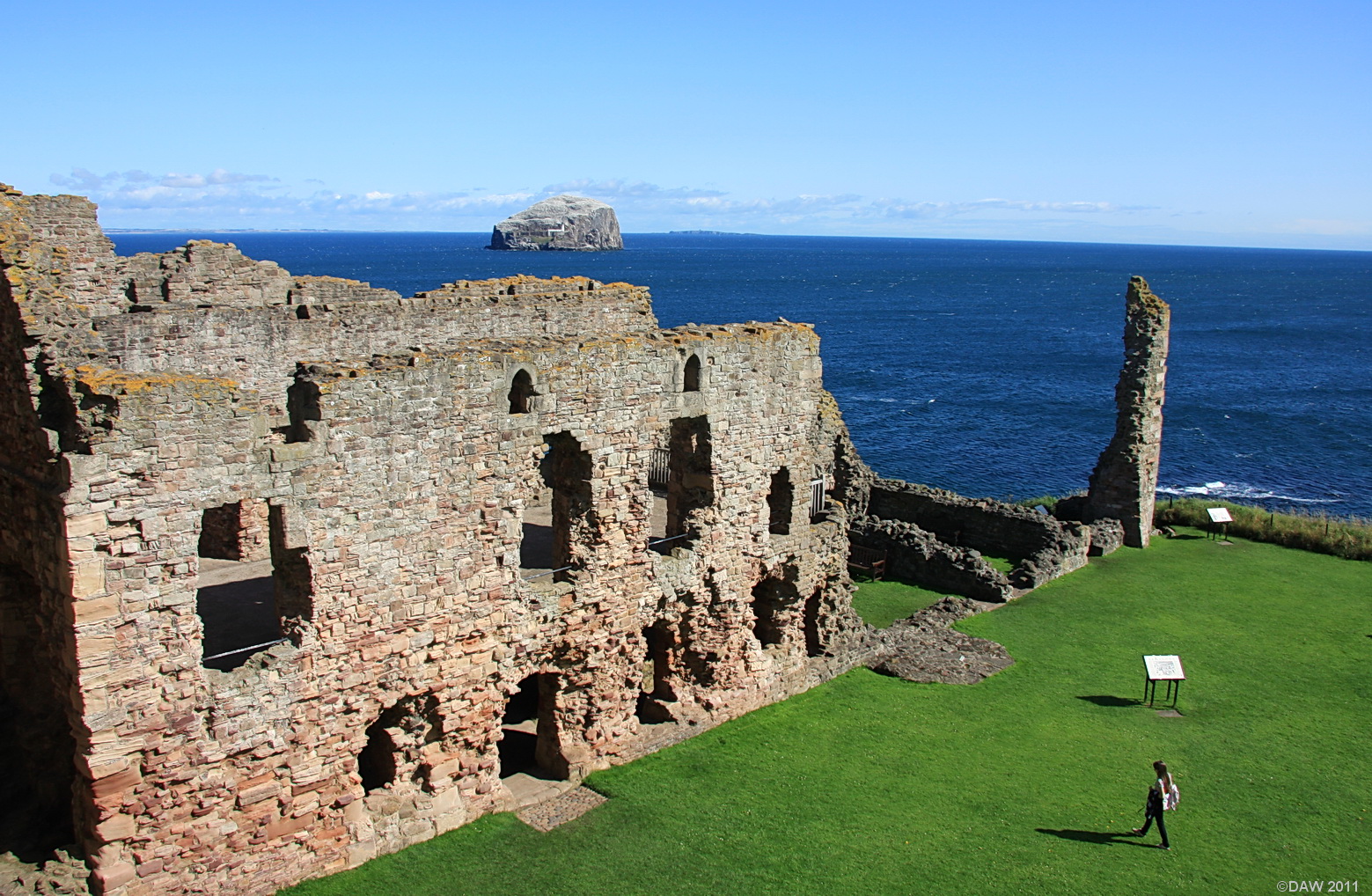 Over looking the ruins of the Hall at Tantallon Castle towards the Bass Rock in the Firth of Forth.