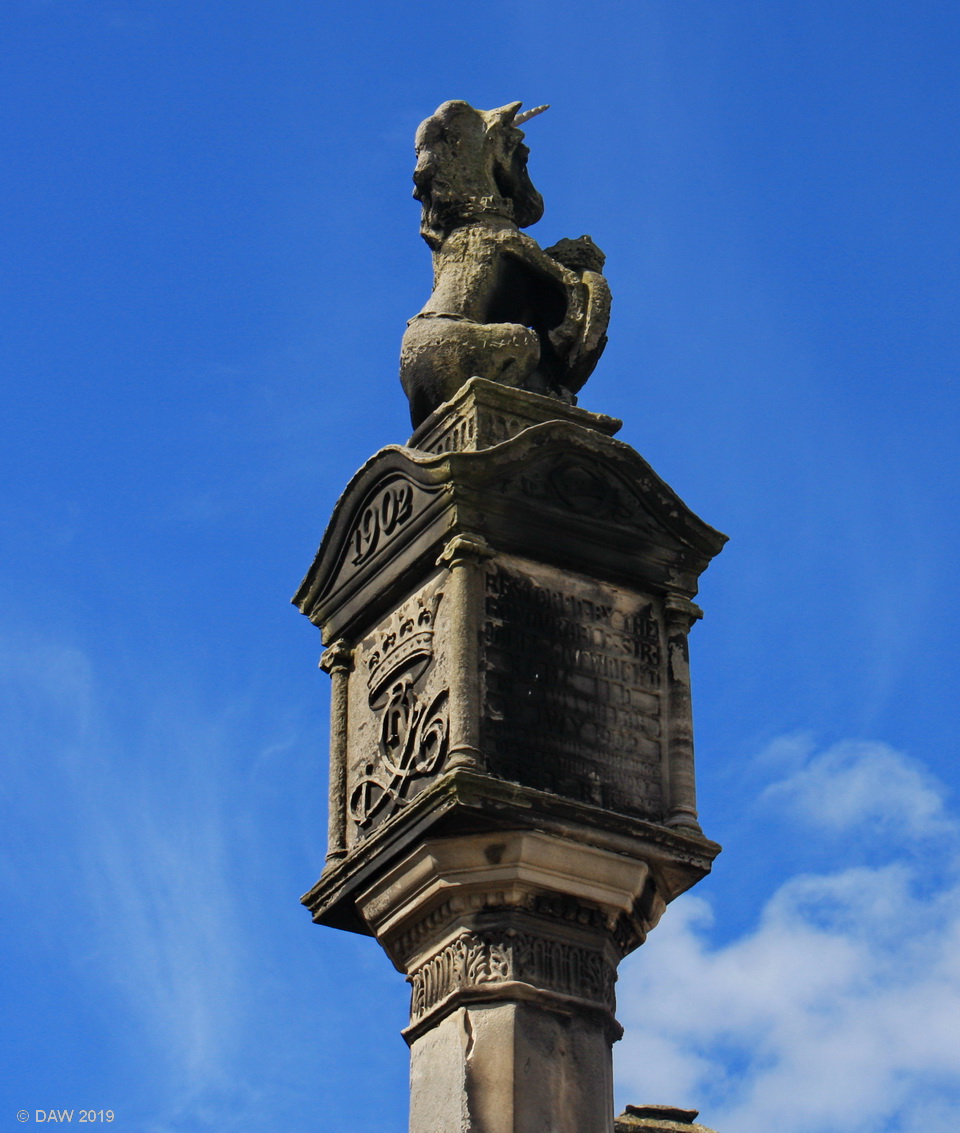 Restored in 1902 the original Mercat Cross is thought to date from the 16th century. Mercat cross's can be found in Cities, Towns and Villages throughout Scotland with the traditional Unicron sitting on top.
