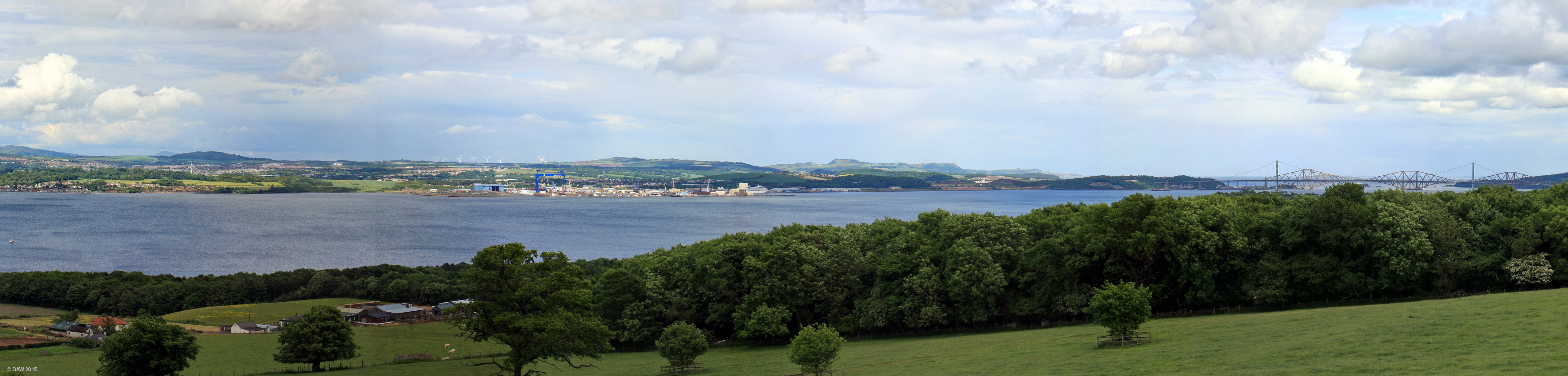 Looking North East from 'The Binns'. On the extreme right are the Forth Bridges. In the centre is Rosyth Dock, the Queen Elizabeth Aircraft carrier is under construction under the blue crane. On the extreme left is the small village of Limekilns. Map location.
