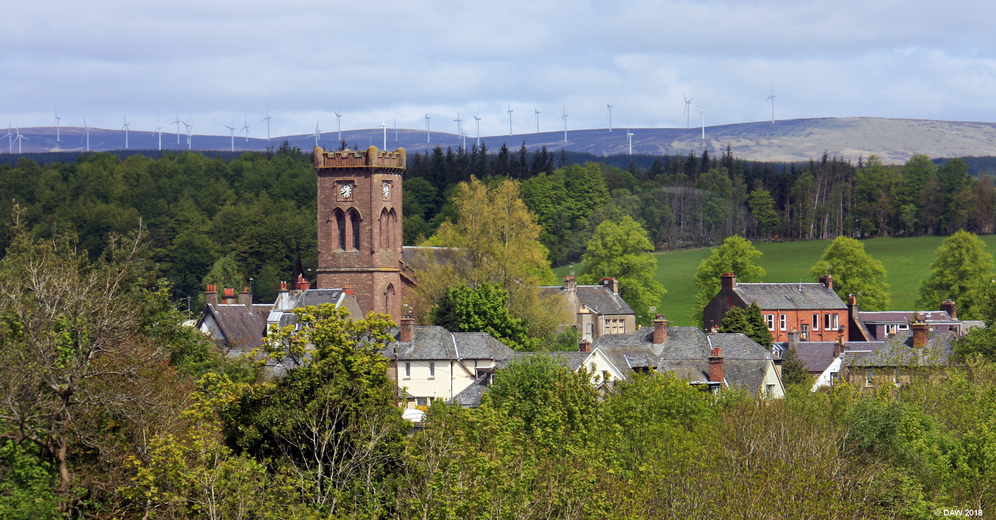Doune as seen from the top of Doune Castle. The Church tower is that of Kilmadock Parish Church, built in 1822. In 2008 the congregation moved to another building and it has been unused since then.
