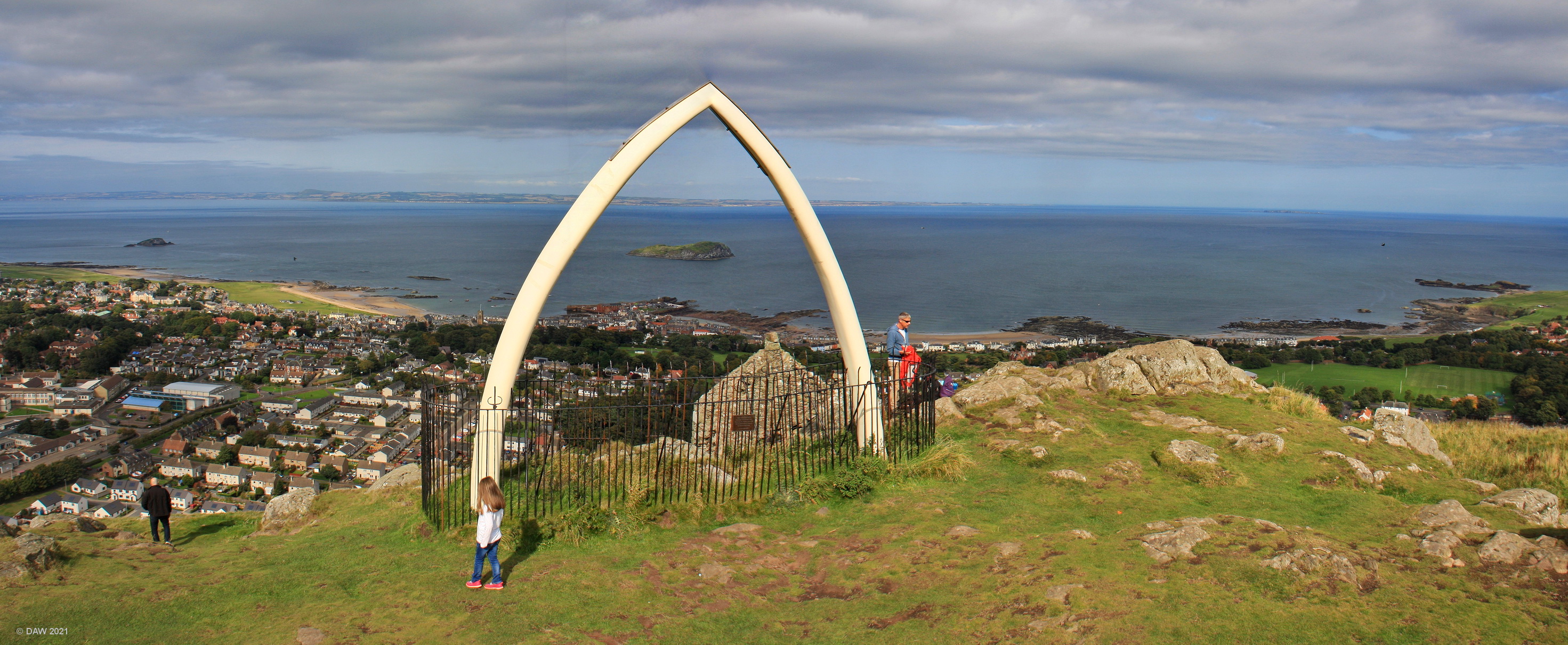 The view from North Berwick Law over the town of North Berwick. Berwick is a conical hill that rises steeply from the landscape and is a local landmark being visible for miles around. There are remains of an iron age fort at the top and since 1709 there has been a whales jawbone. Since then it has been replaced 4 times, the final time in 2008 when a fibreglass replica the same size as the previous was installed. Map location.