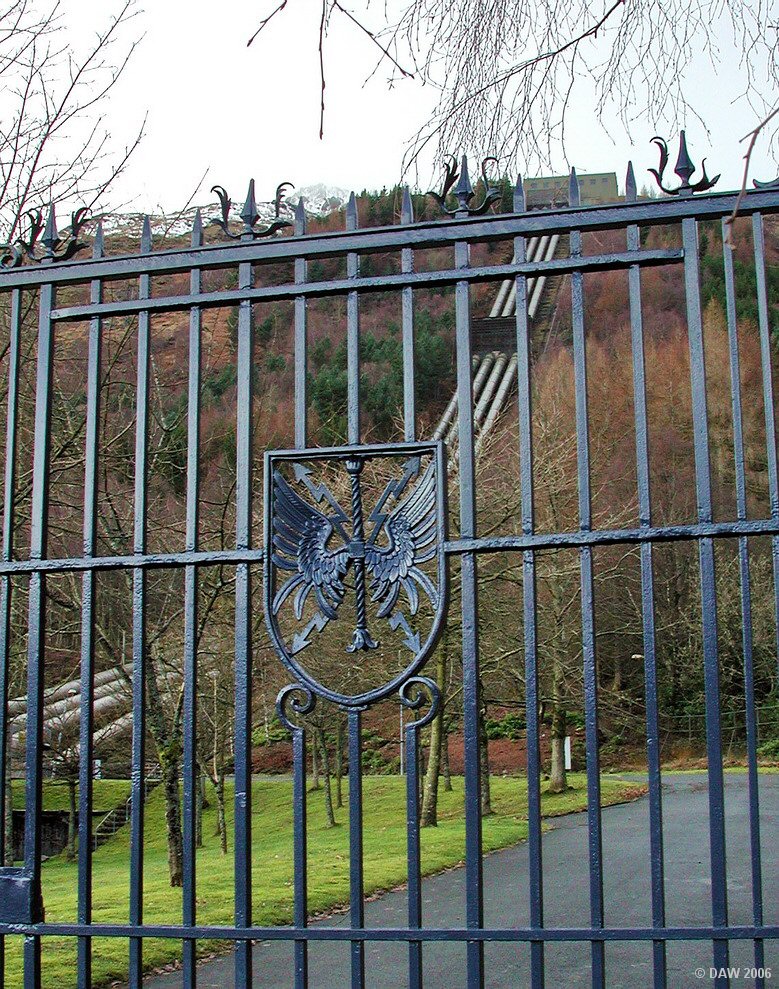 Located on the shores of Loch Lomond at Inverueglas Bay this is part of the Loch Sloy Hydro scheme.  A 3km tunnel carries water from Loch Sloy to the valve house you can see at the top of the hill.  4 Turbine sets within the Power station at the end of the Pipes generate 152Mw of peak demand electricity.  Completed in 1950 in a time when designers still had the courage to put in details like this impressive gate.