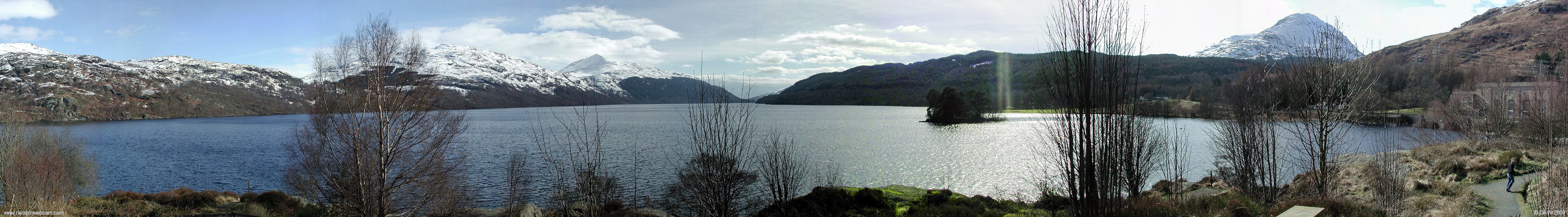 A panoramic view down Loch Lomond from the Inveruglas view point.  Inveruglas Island is the small clump of trees in the water just right of centre.  The snow cover peak of Cruach Tairbeirt rises to 415m on the right.  On the left is Cruinn a' Bheinn at 632m and behind that is Ben Lomond rising to 974m in the distance.  [url=http://www.streetmap.co.uk/map.srf?X=232300&Y=709872&A=Y&Z=120/] Map location. [/url]