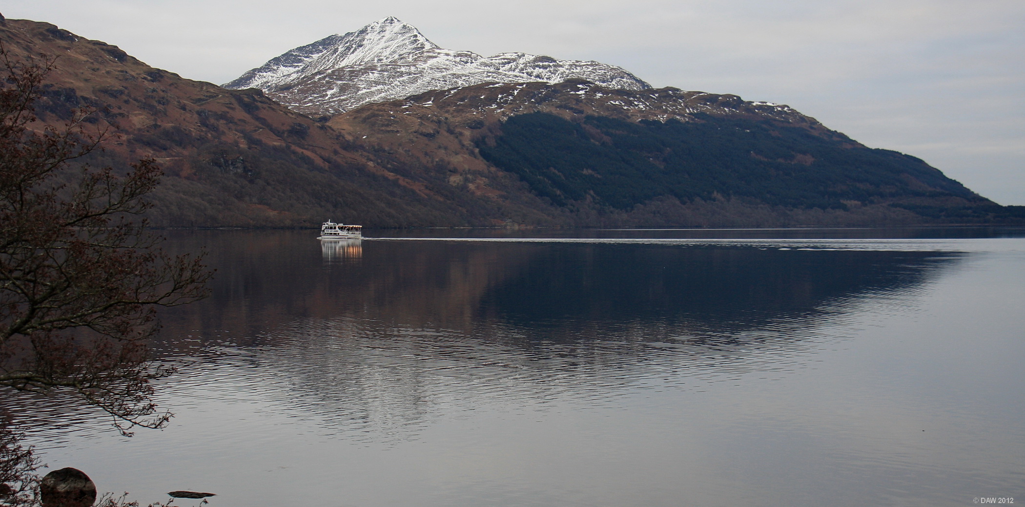 The passenger ferry crossing Loch Lomond from Inveruglas to Inversnaid Hotel on a cold January day. Ben Lomond is in the background.