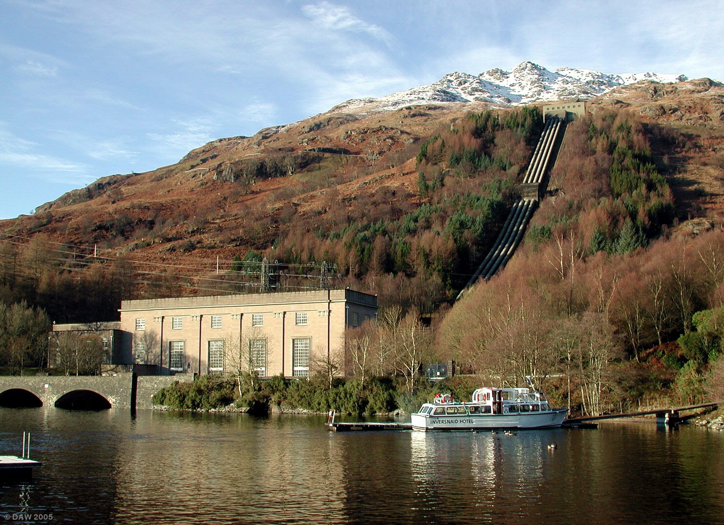A tunnel 3km long carries water from Loch Sloy through Ben Vorlich, towering  940m above Loch Lomond, to the valve house.  From there the water plunges down the mountain side in 4 pipes to the Turbines of Sloy Power Station.  This is the largest conventional Hydro Power station in the UK with a capacity of 152 Megawatts.  It can be running at full load within 5 minutes from a standing start. [url=http://www.multimap.com/map/browse.cgi?lat=56.251&lon=-4.71&scale=25000&icon=x/]Map Location[/url]