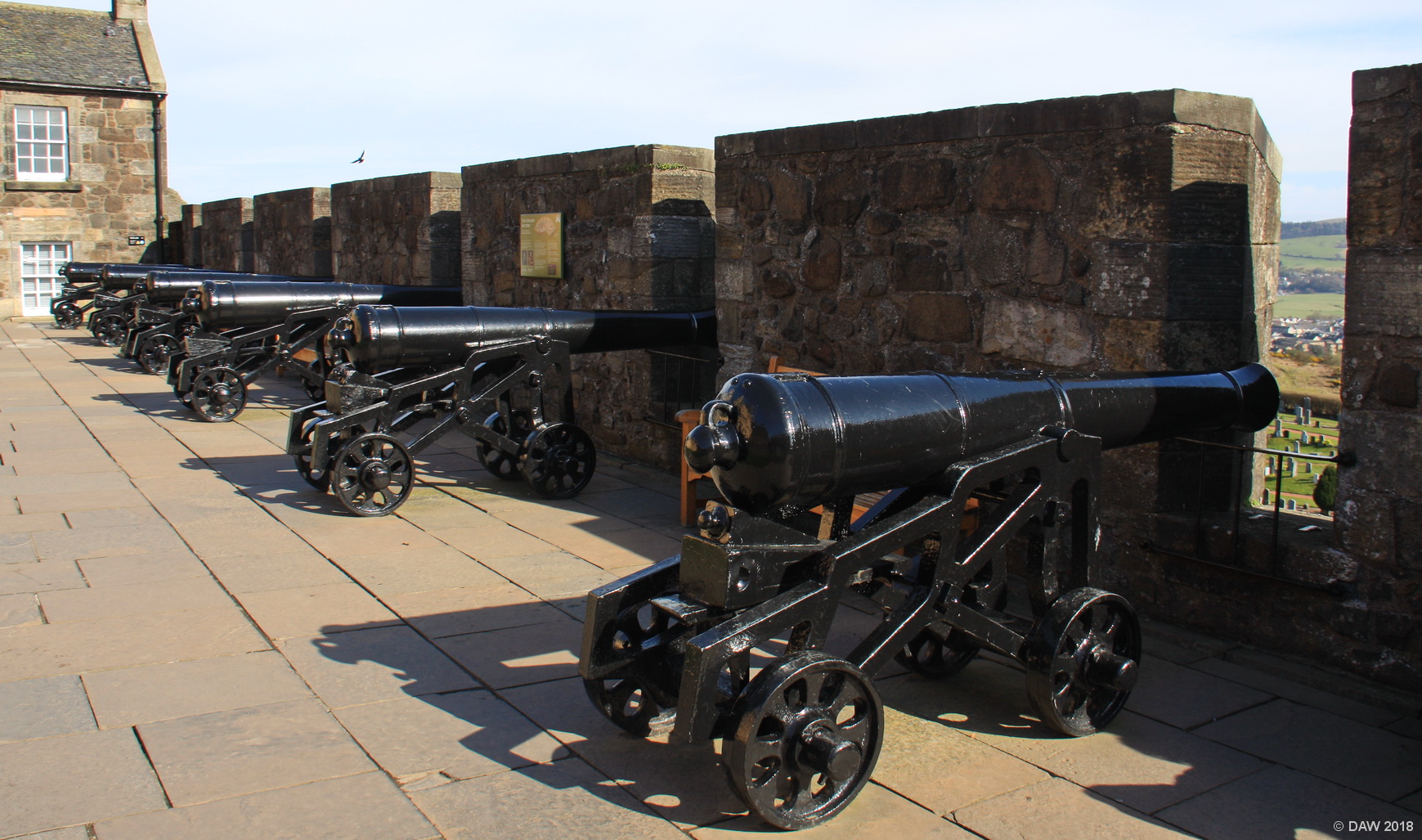 Built in 1689 as a defence against the Jacobite threat, the master Gunners House is in the background. The battery was used to great effect on 6th January 1746 to destroy a Jacobite artillery emplacement on Gowan Hill.