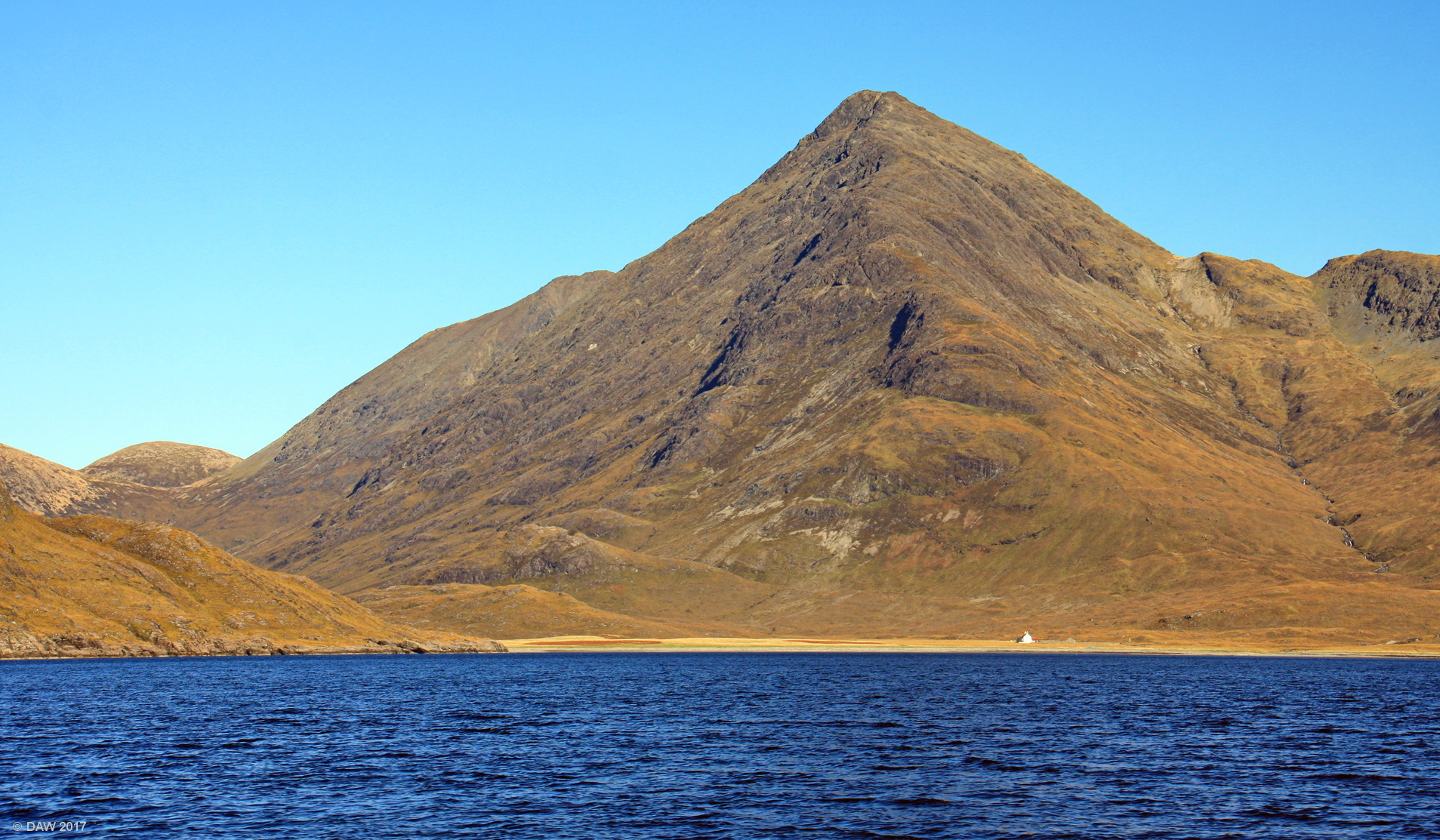 Looking over towards Camasunary Bay from Loch Scavaig. Bla Bheinn rises to some 928 metres in the background. The white house is the Camasunary Bothy for walkers.