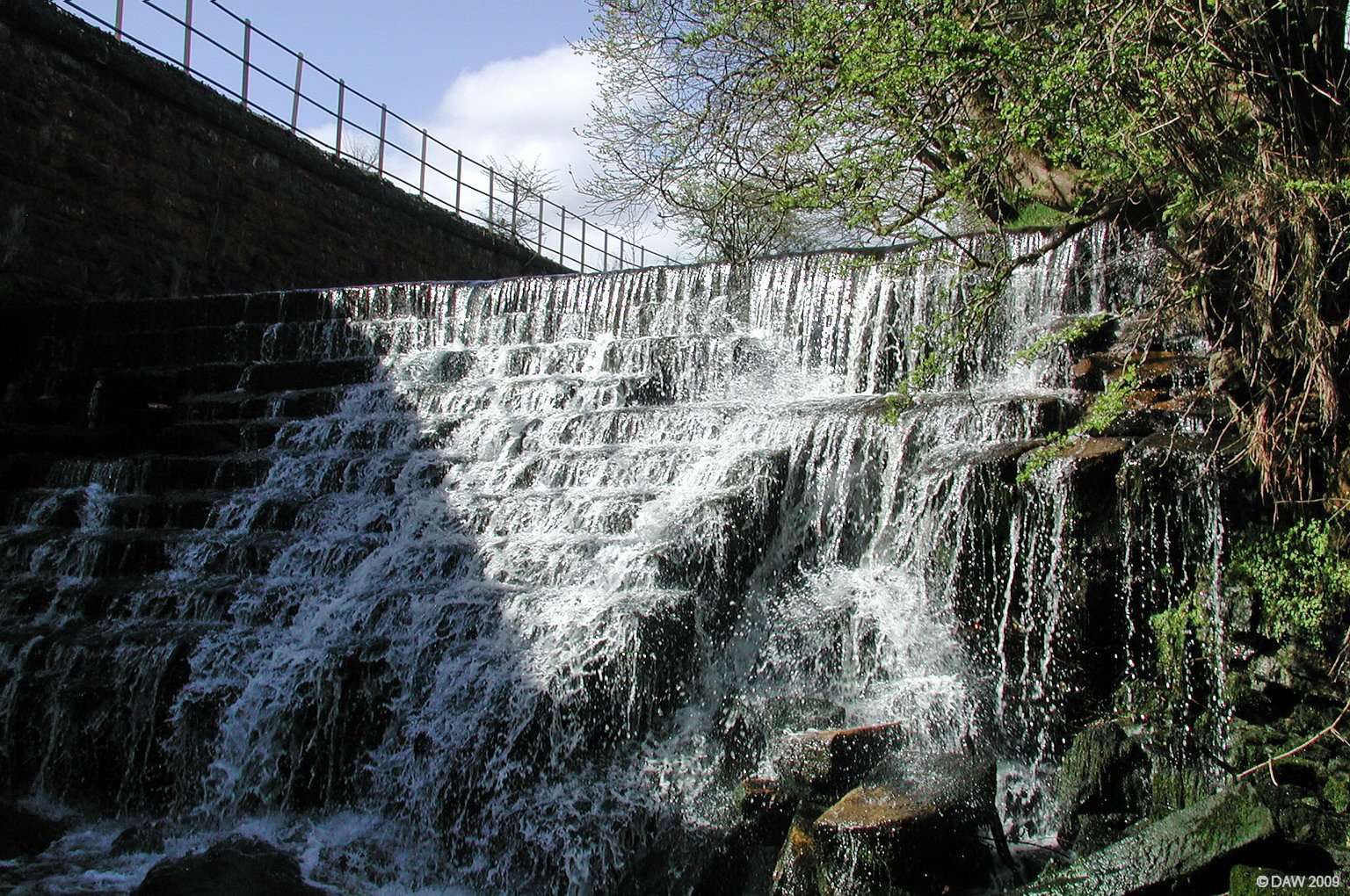 One of the weirs on the Levern water that were constructed in the 1860's when the railway line to Kilmarnock was built. Due to the narrow valley the railway passes through it required realignment of the both the Levern and the existing road. Map location.