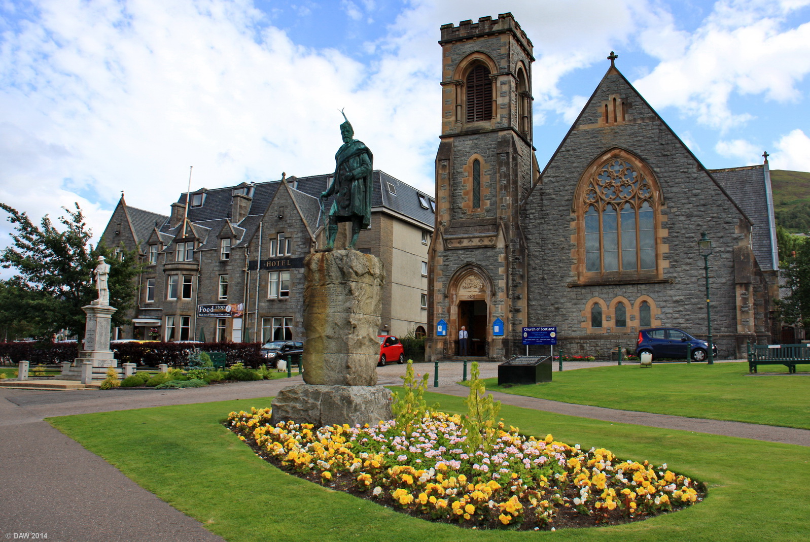 If you walk to the end of the high street you get to the this public area.  The statue in the foreground is of Donald Cameron, the 24th chief of Clan Cameron.  To the left is the war memorial, the Church is the Duncansburgh Macintosh Parish Church and dates from 1882.  It is built from Ballachulish granite faced free stone. [url=http://www.streetmap.co.uk/map.srf?X=210342&Y=773993&A=Y&Z=106&ax=210400&ay=774077/] Map location. [/url]