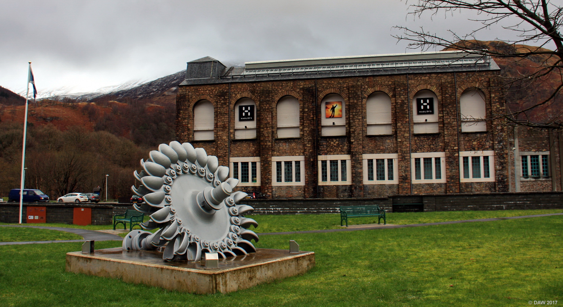 This is about all that remains of the large Aluminium Smelter that was built here between 1905 and 1909. It had its own Hydro Electric power station, the largest of its type at the time. One of the turbines can be seen here. This building is found a new use as an Ice climbing centre.