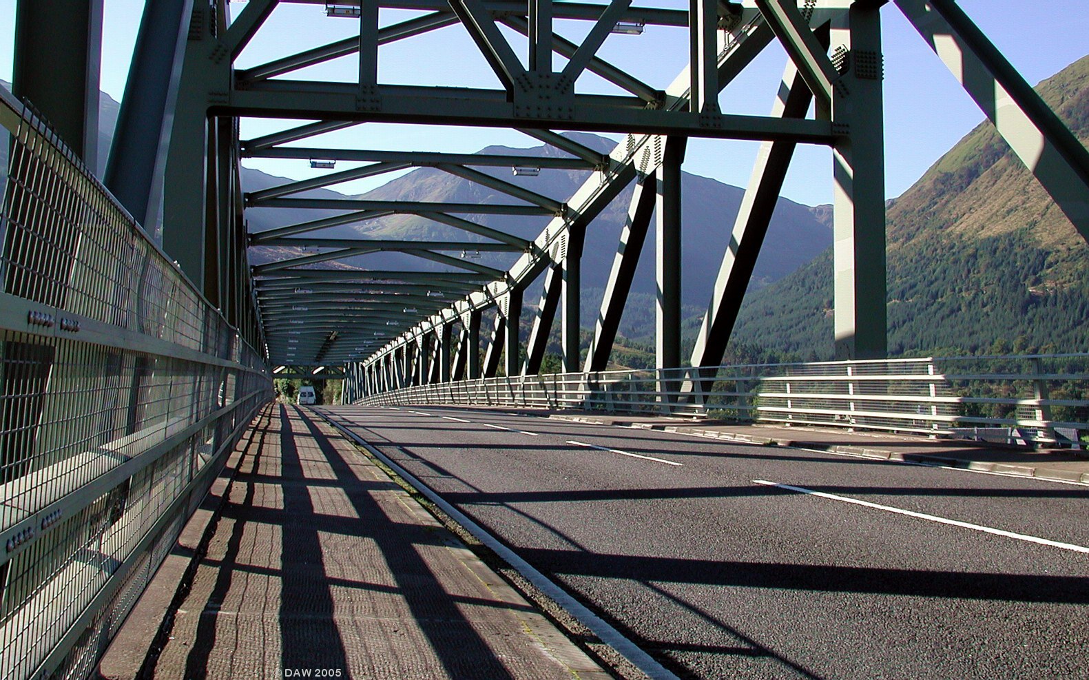 This view is from the north end of the bridge looking south. The steel cantilever bridge was constructed in 1974. It replaced a ferry which ran across the Loch at the same spot, the alternative being a 22 mile drive round the Loch via Kinlochleven.