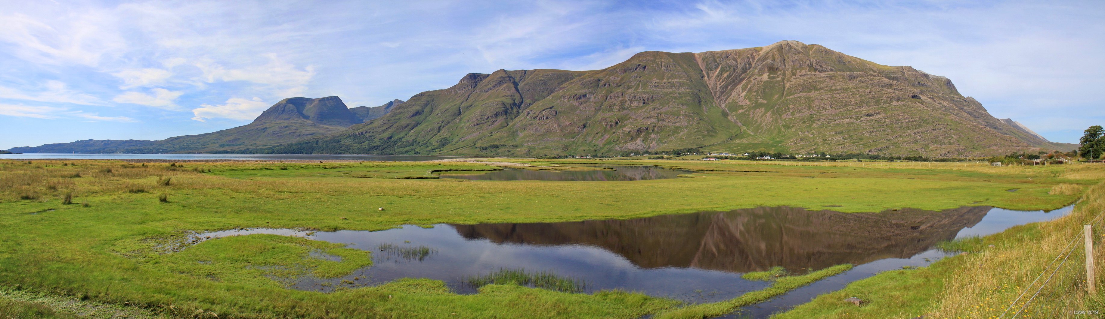 The small village of Torrdon can be seen at the base of the mountains right of centre, towards the left is the end of Loch Torridon. The highest peak here is actually the one that looks lower on the left, Tom na Gruagaich rising to 922m. Map location.