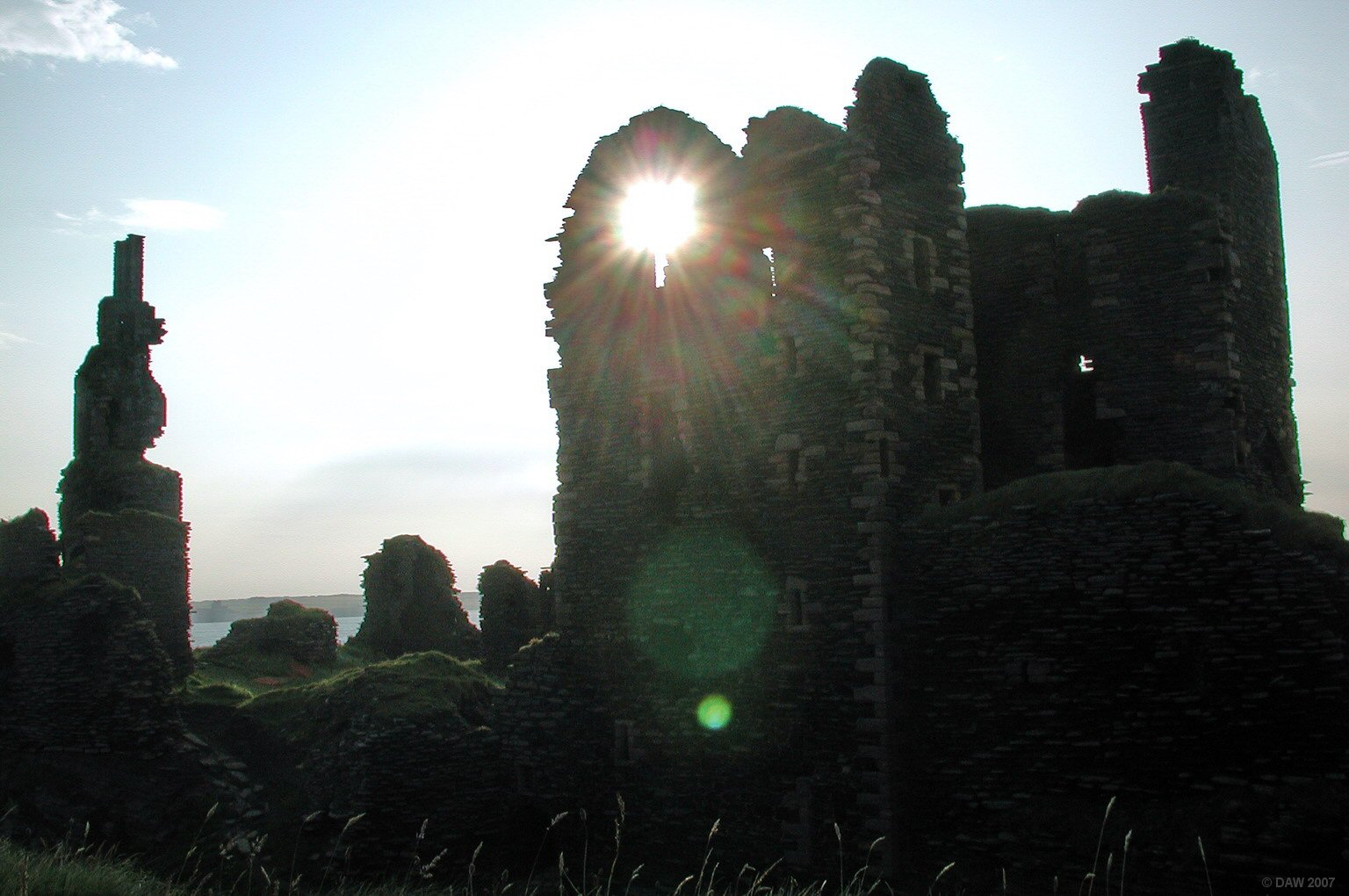 The evening sun shines through the ruins of Castle Sinclair.  You get the impression that one winter storm could bring some of this tumbling down, particularly  the very high structure on the left. [url=www.multimap.com/map/browse.cgi?lat=58.4777&lon=-3.0656&scale=25000&icon=x/]Map location[/url]
