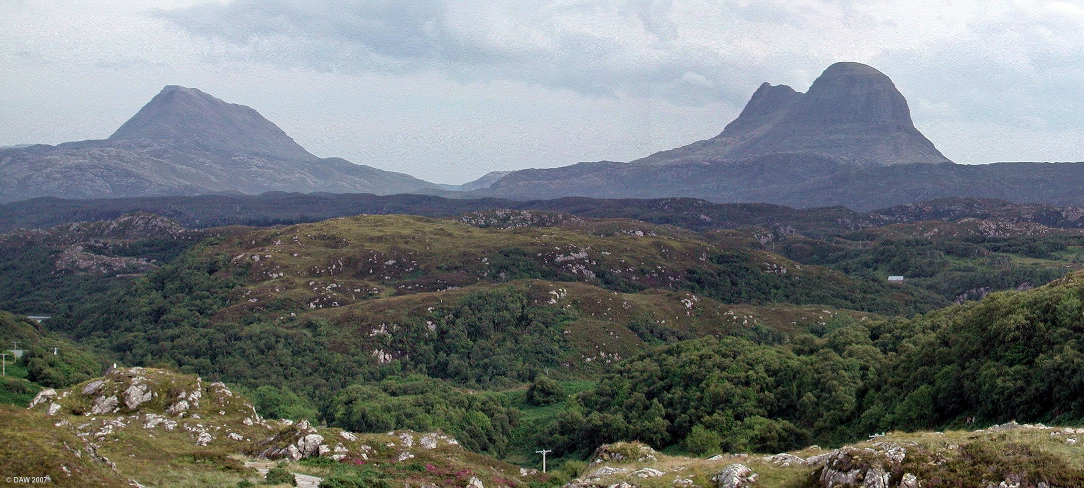 The mountains on the skyline are remnants of reddish-brown Torridonian sandstone, capped by younger & harder white quartzite. Prolonged erosion of the sandstone has exposed a "fossil" landscape in the underlying grey Lewisian Gneiss of the foreground. These are the oldest rocks in Britain, dated in parts at around 3,000 million years. Map location