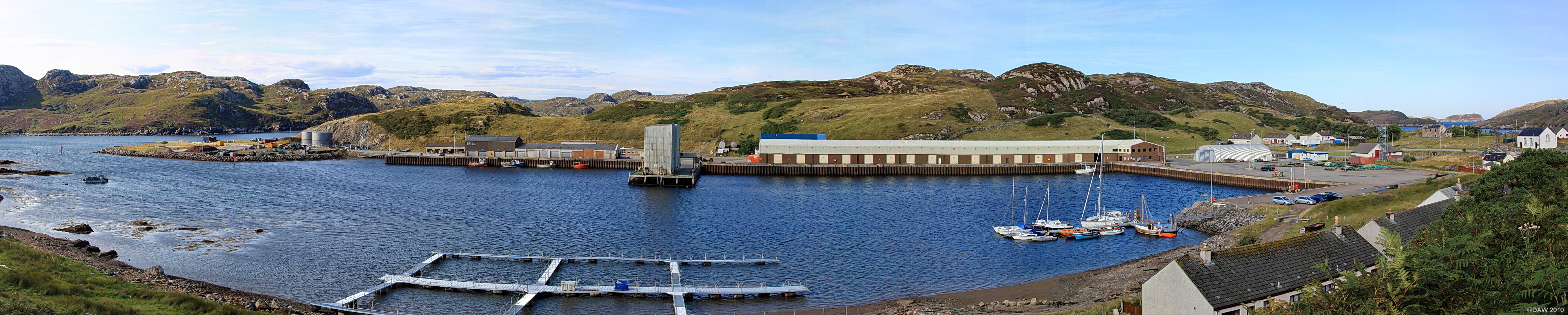 As you drive north from Ullapool you may be surprised how good the roads are, the reason is the large fish handling depot seen here at Kinlochbervie. Kinlochbervie only has a small fishing fleet of its own but boats from the east coast land their catches here and they area taken away by refrigerated articulated lorries. On the extreme right you can see the presbyterian Church dating from 1829 Map location.
