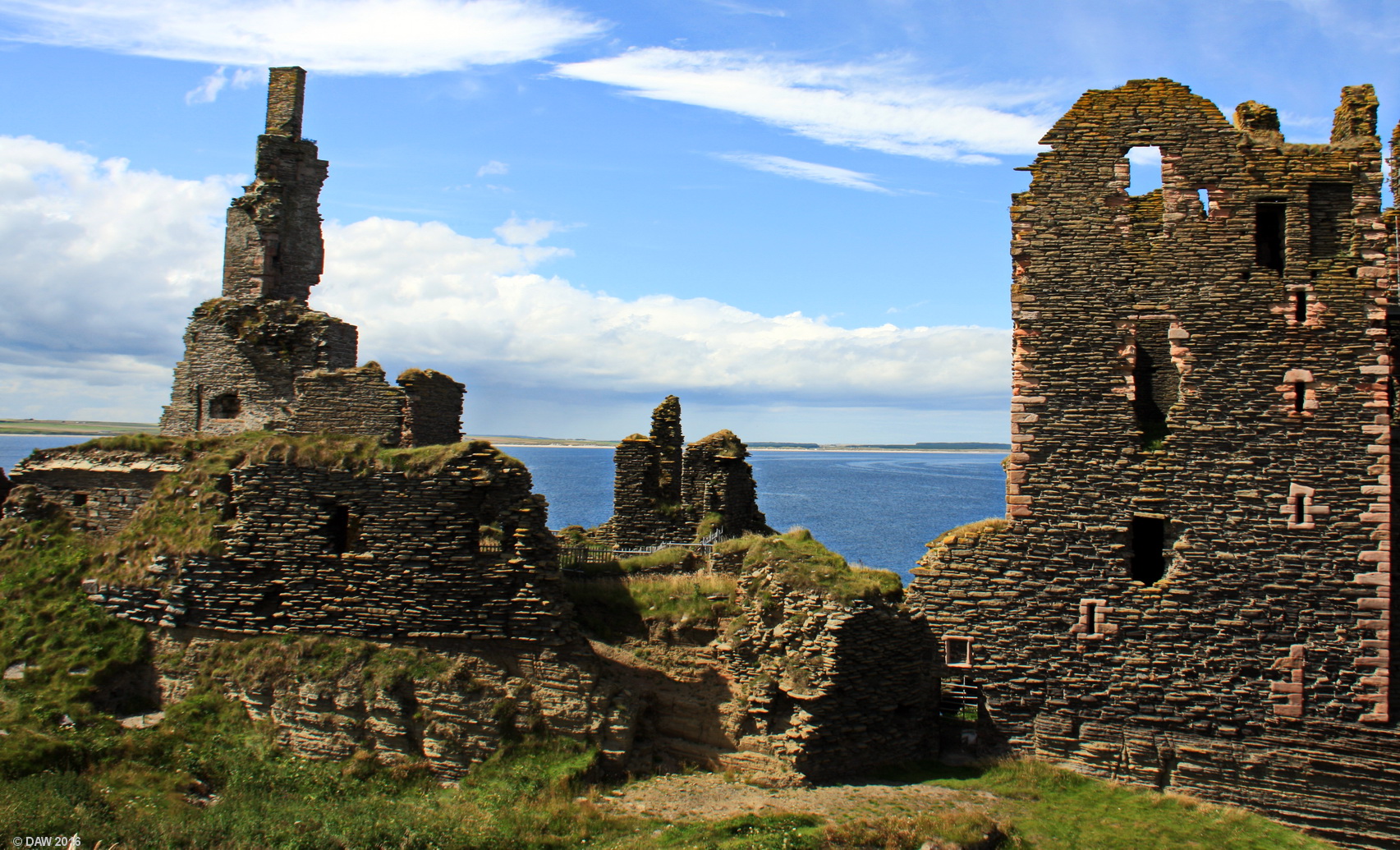 Looking across to the ruins of Sinclair Castle at Noss Head near Wick. The sandy beaches of Sinclairs Bay can be seen in the background. A