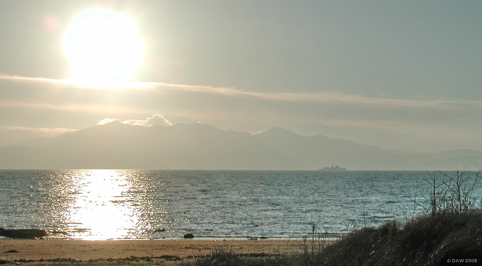 A visting NATO Frigate heads up the Clyde between Arran and the Ayrshire Coast.  [url=http://www.multimap.com/map/browse.cgi?lat=55.6704&lon=-4.8474&scale=25000&icon=x/]Map location[/url]
