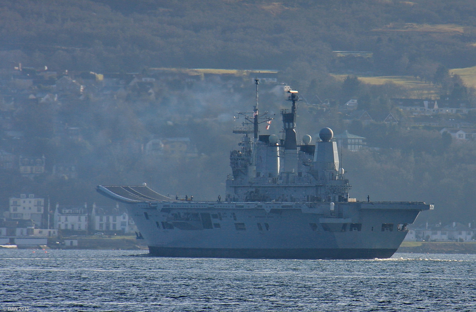 Taken from Kilcreggan looking over towards Gourock early in 2010. Just over a year later Ark Royal was decomissioned. This view shows the ramped flight deck allowing the Harrier Jets to carry a heavier payload than if they were to launch vertically. Map location.