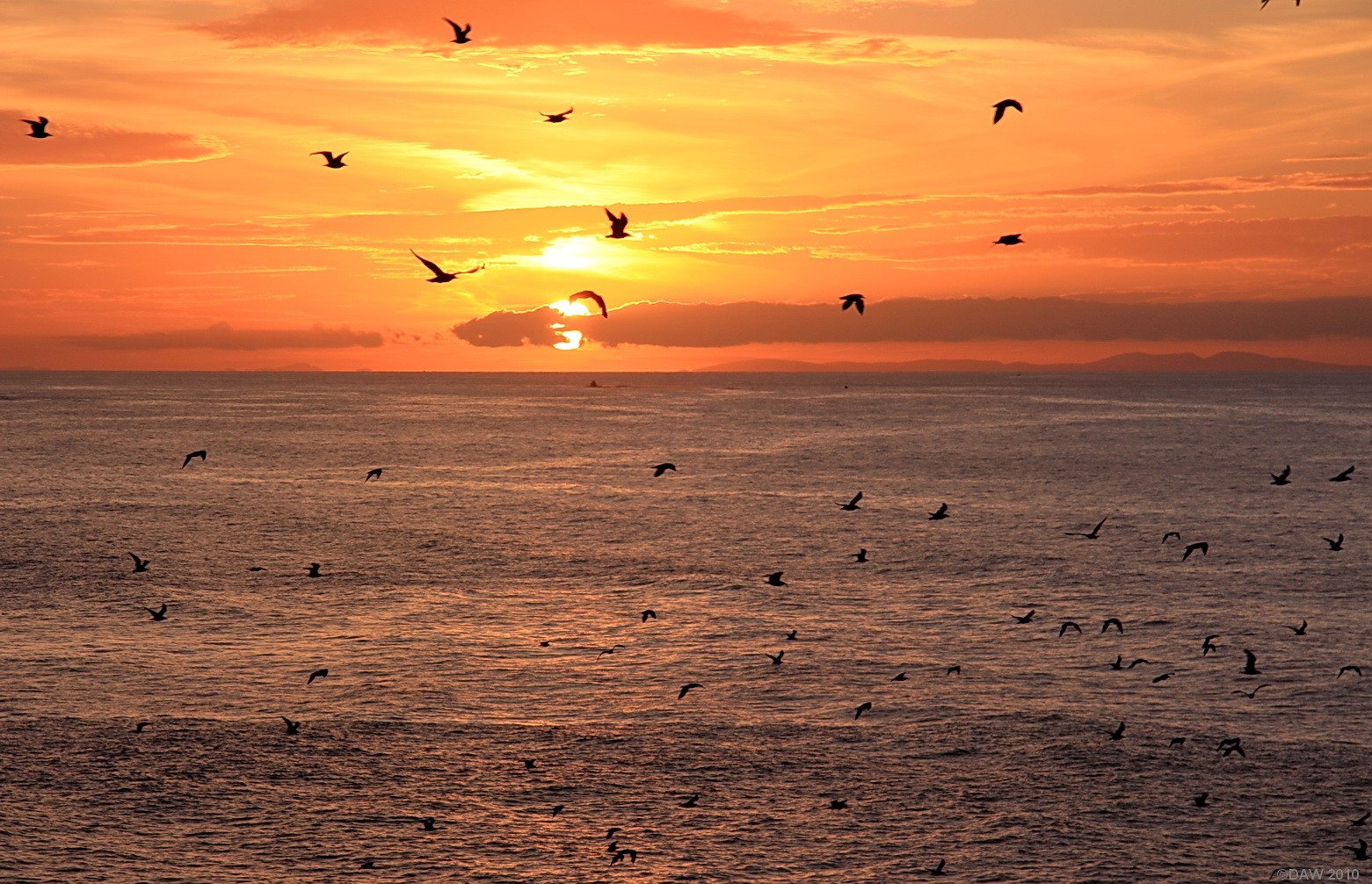 Looking out over the Moray Firth from Macduff as the seagulls fly past heading for their roost. The hills in the distance are probably around Helmsdale.