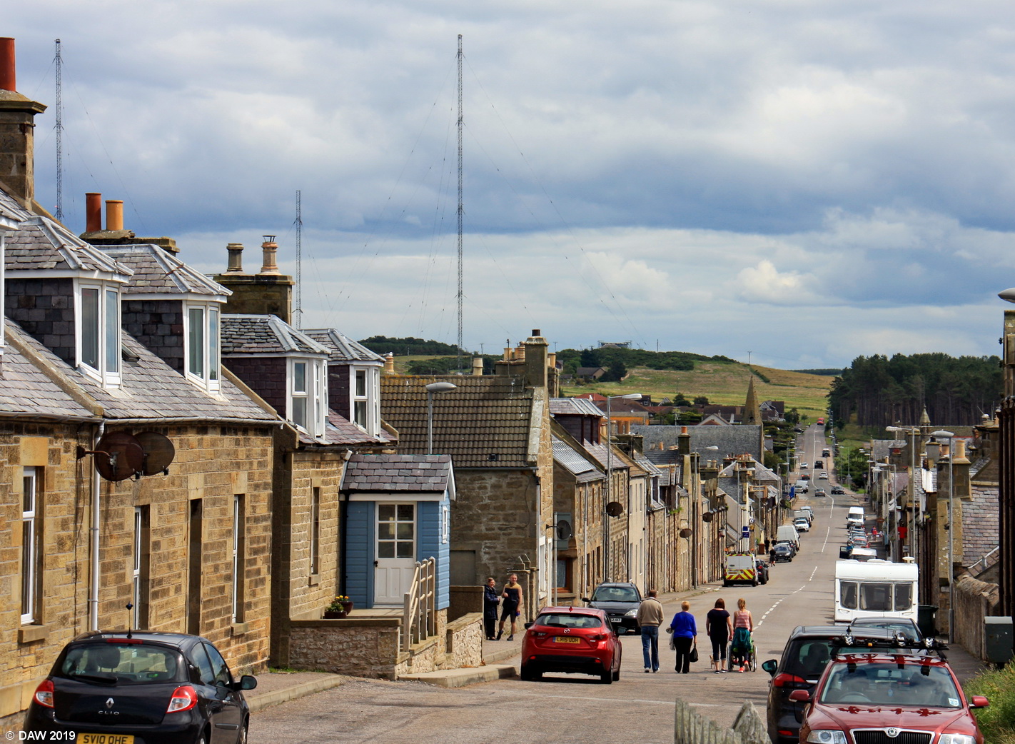 Looking down Grant Street in the coastal village of Burghead. The aerial masts in the background date from 1936 and broadcast BBC Radio 4 Long Wave, one of only three sites in the UK to do so.