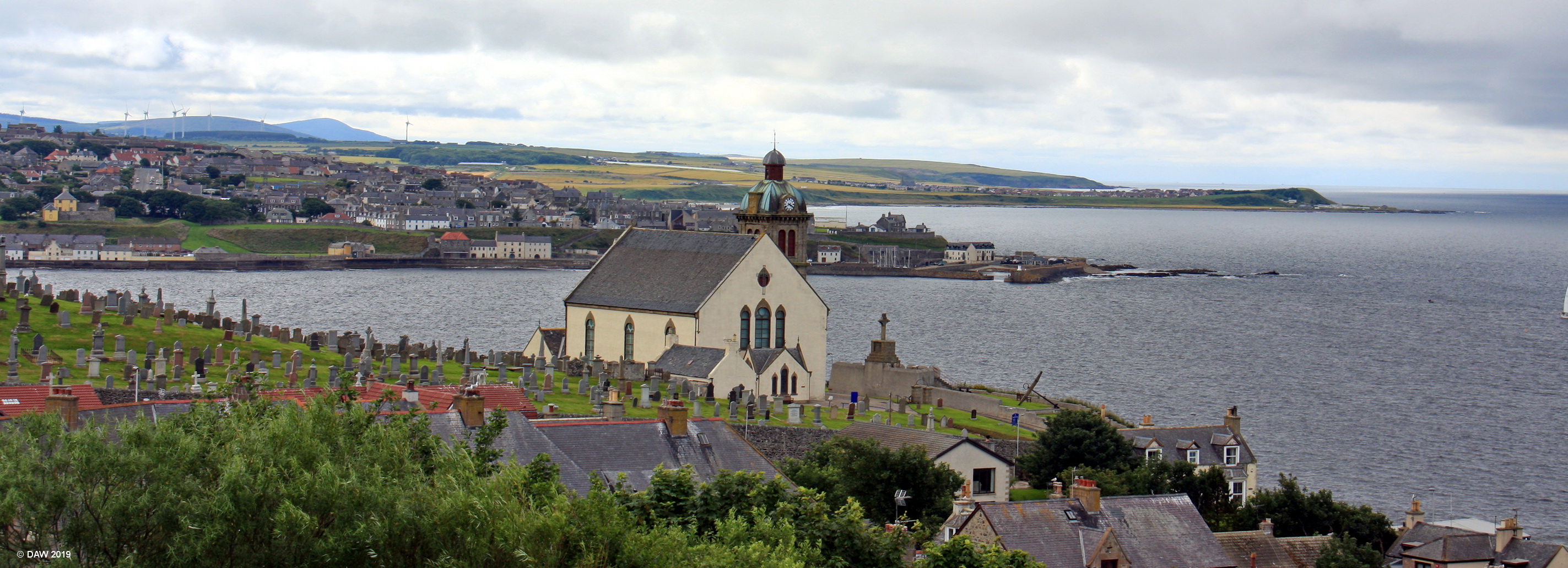 The landmark building of Macduff Parish Church sits above the Aberdeenshire coastal town of Macduff. The church was built in 1805, in front of the church is the town cross, erected in 1783 by the second Earl of Fife, who named the town Macduff. Across the bay the town of Banff can be seen. Map location.