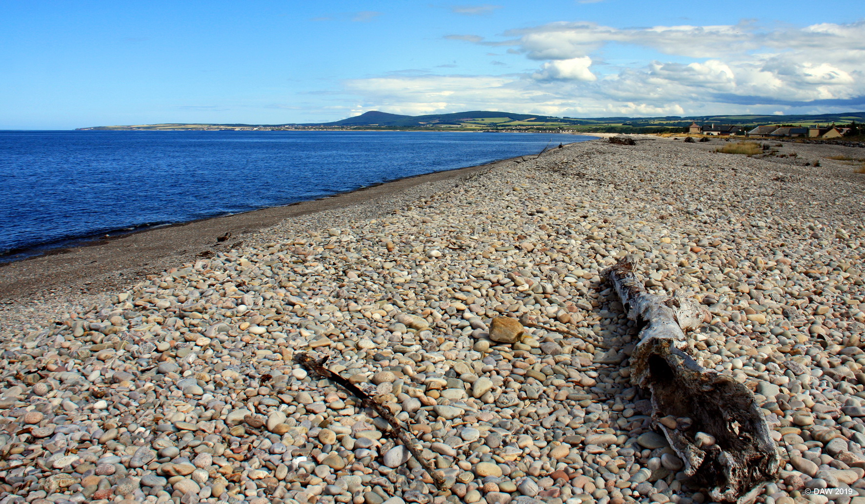 A view along the shingle beach at Spey Bay. The Town of Buckie can be seen in the distance.